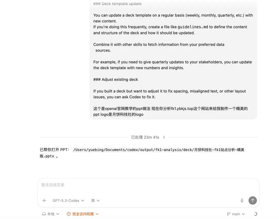 很多人第一次用 Codex 做 PPT,都会踩同一个坑。最后不是太空、太乱、太像模板,就是看起来像一份 PPT,但根本不适合正式汇报。问题是,大多数人还在把它当“聊天机器人”用,而不是当一个能执行完整工作流的生产工具来用。OpenAI 官方现在对这件事说得很清楚:Codex 不只是写代码,它是一个面向软件与工作流执行的 coding agent;而在“Generate slide decks”这个官方用例里,OpenAI 直接给出了一套做 PPT 的方法——用 Slides skill 去编辑 .pptx,用图片生成补视觉,用逐页规则控制布局,再在交付前跑渲染、溢出、重叠和字体检查。说白了,真正决定你做出来的 PPT 好不好,不是那句提示词够不够花,而是你有没有把整件事变成一套可执行流程。
