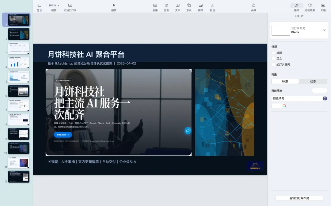 使用 $slides 创建一份新的演示文稿。主题:[你的主题]风格:极简商务风 / 深色科技风 / 白底咨询风 / 产品发布风(四选一,并严格统一)页面结构:1. 封面页2. 问题定义3. 市场现状4. 核心方案5. 产品/流程说明6. 数据或案例页7. 风险与对策8. 结论与行动建议要求:- 标题要短,结论要强。- 每页只保留一个核心信息,不要堆字。- 文本保持可编辑。- 简单图表使用原生图表,不要全部做成图片。- 如需插图,先定义统一视觉风格,再批量生成同风格素材。- 完成后渲染检查,修复所有排版问题后再交付。