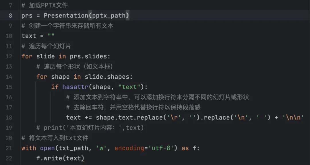 在Python中,处理PPT文件,将文本内容提取保存到.txt文件。可以使用库python-pptx,用于pptx格式。当ppt页数较多时,这种方式比粘贴复制效率高很多。