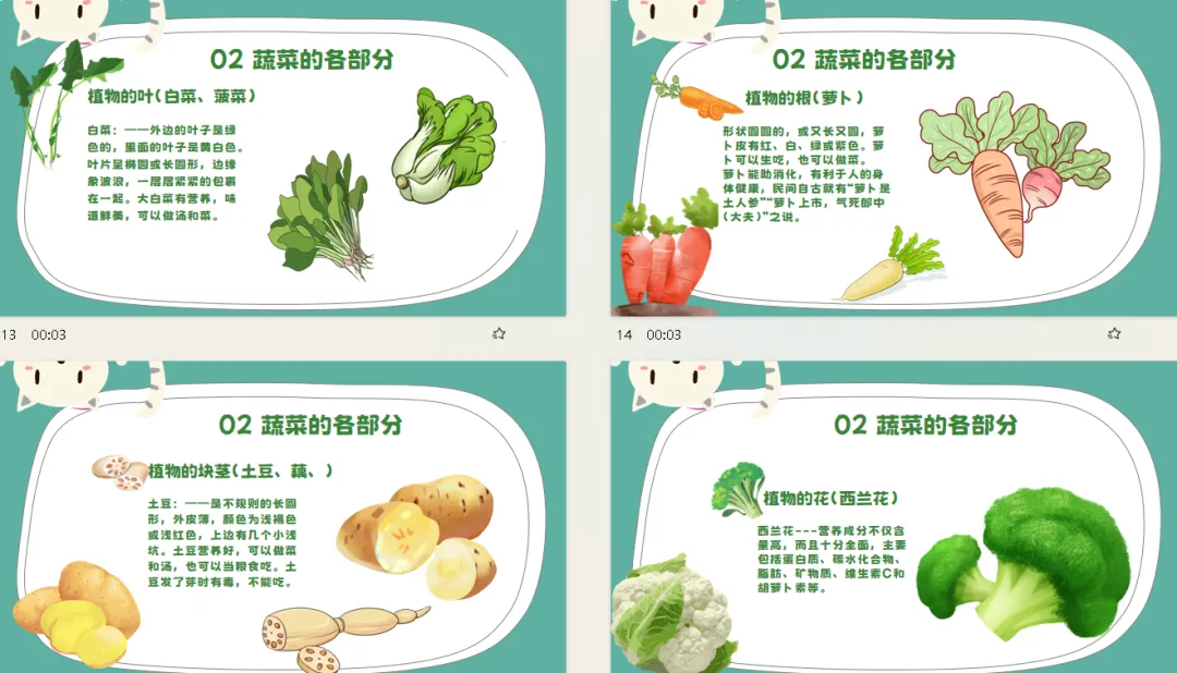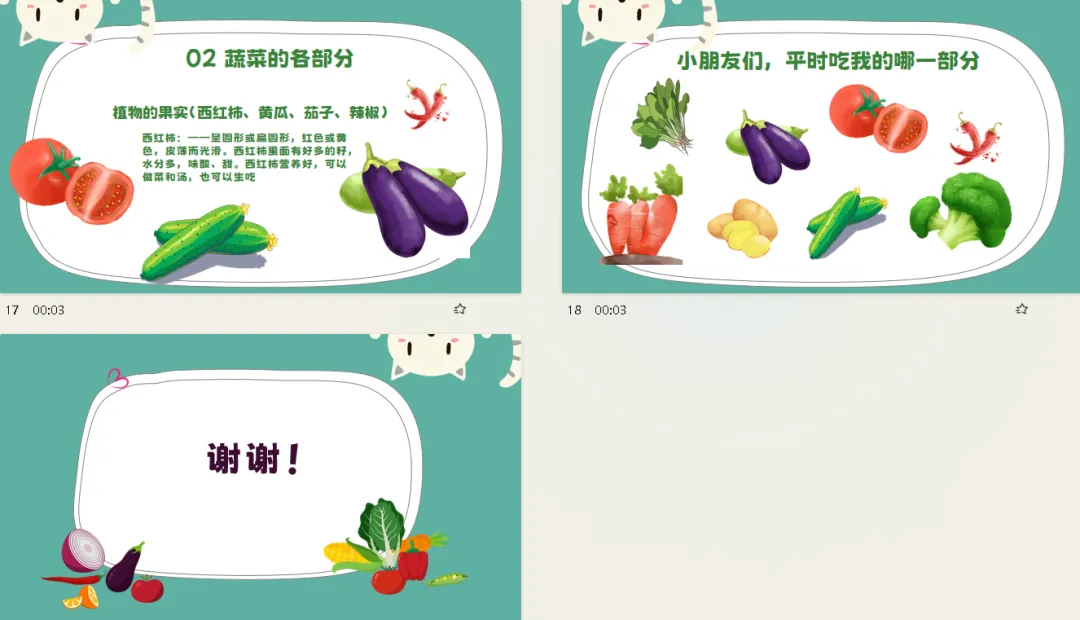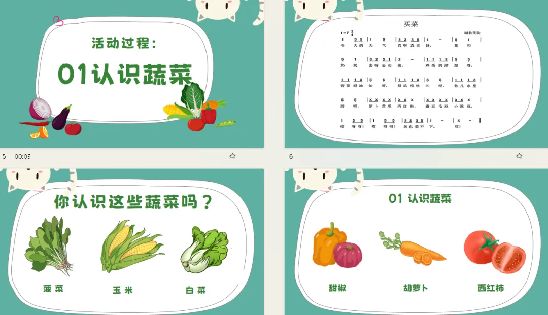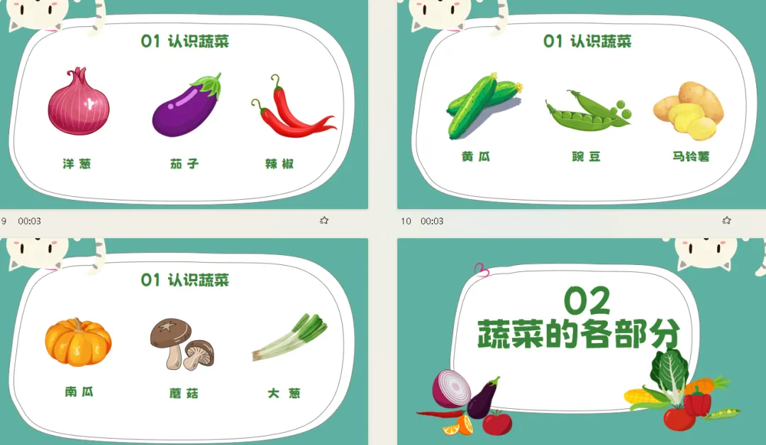 蔬菜是指可以做菜、烹饪成为食品的一类植物或菌类,蔬菜是人们日常饮食中必不可少的食物之一。蔬菜可提供人体所必需的多种维生素和矿物质等营养物质。蔬菜是我们日常餐桌上的基本菜,像莴笋,芽白,芹菜,茄子,菠菜等都是的。小班活动《可爱的蔬菜宝宝》选自科学领域中的一节教学活动。本节教学活动通过各种蔬菜图片,让幼儿了解各种蔬菜以及蔬菜的组成部分,了解生活中常见的蔬菜以及我们吃各种蔬菜的哪一个部分,结合生活实际,提高幼儿的科学知识,拓宽幼儿的视野。