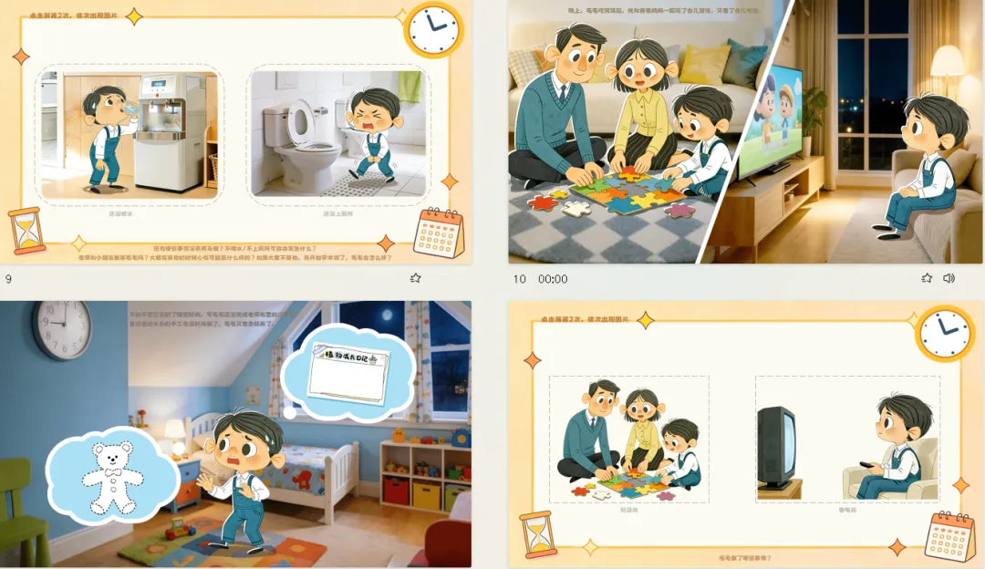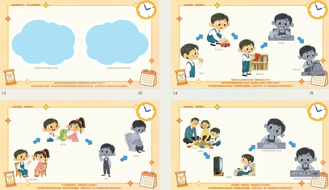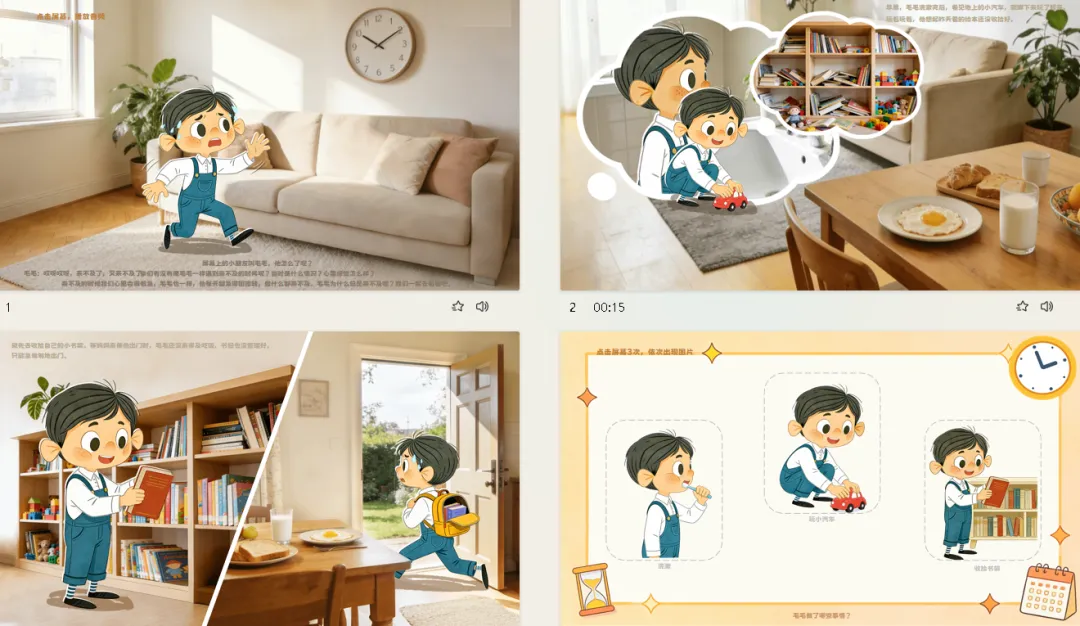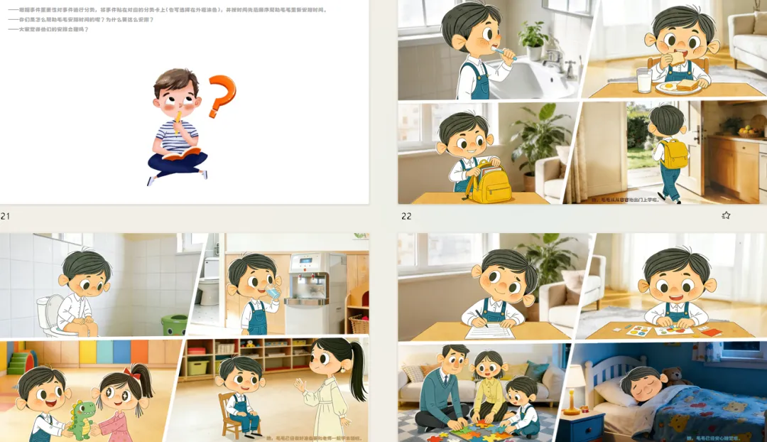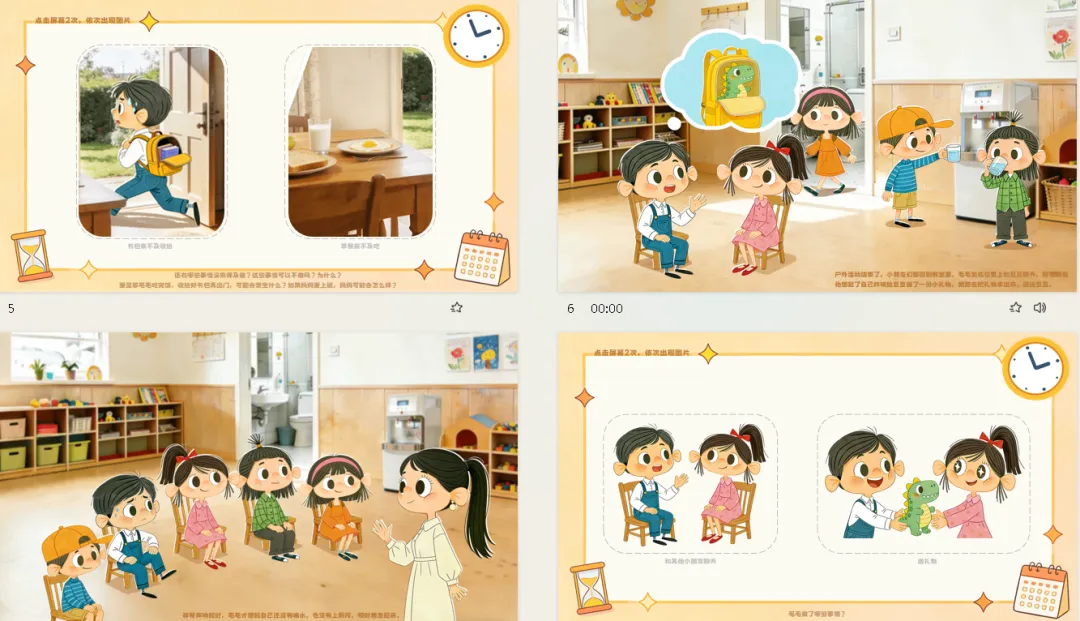 大班幼儿即将步入小学,面临更多需要自主安排时间的场景——从早晨入园到放学回家,从游戏活动到生活环节。然而,幼儿往往缺乏区分事务轻重缓急的意识,导致“来不及”现象频发。本次活动通过呈现主人公“毛毛”在生活中的三个“来不及”场景,引导幼儿自主发现问题、分析问题、学习方法、合理规划,帮助幼儿理解“要事优先”的时间管理智慧,学会合理安排时间,为幼小衔接做好生活准备。