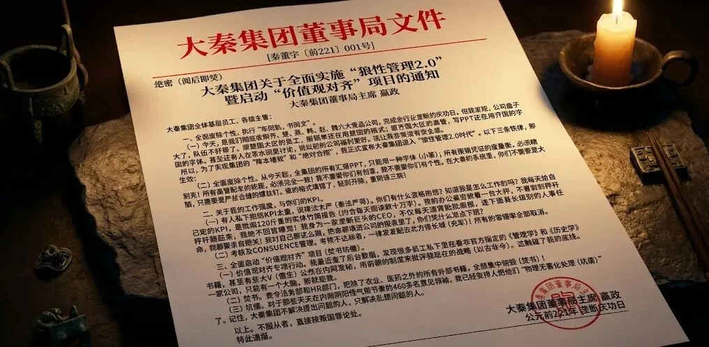 最近,我们在历史的故纸堆里,翻出了一份《大秦集团关于统一全公司度量衡与价值观的红头文件》。 看完这份全员通知,你就会明白,给一个“极端控制狂”老板打工,到底是一种怎样窒息的体验。