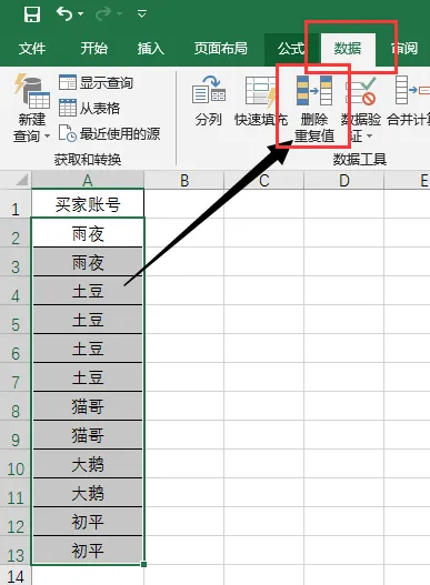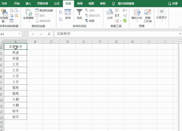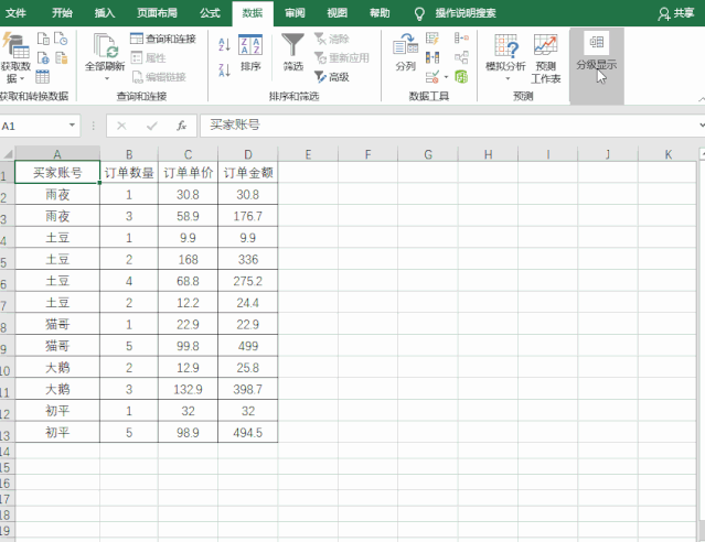 分类汇总前先要对买家账号进行排序,(这里已经排过序就不需要再排序了)