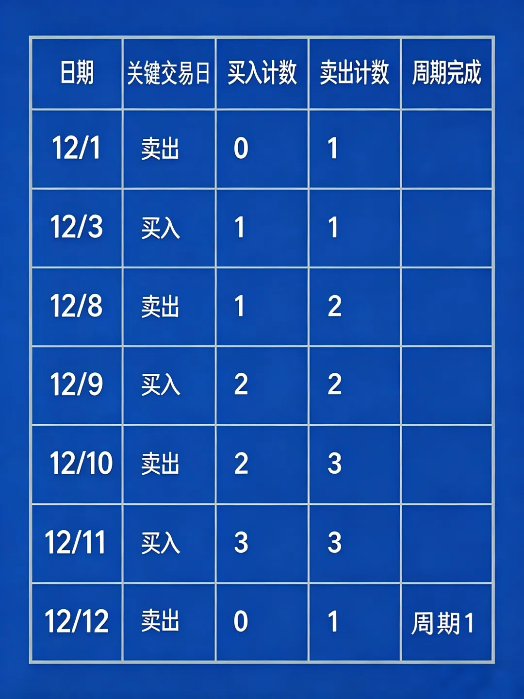 从标记序列的起点开始。为被系统标记为“买入”和“卖出”的交易日分别设立计数器。当两个计数器的数字首次同时达到3时,一个周期宣告完成。这个结束点立刻成为下一个周期的起点,所有计数归零,游戏重新开始。