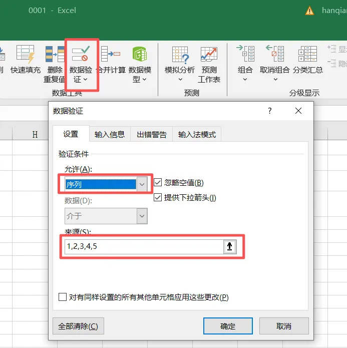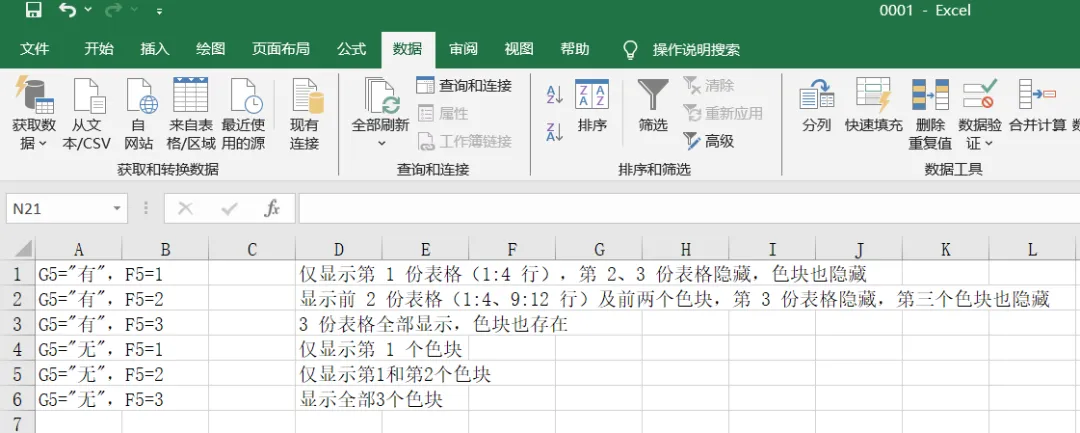 说明: F5和G5 是下拉选择表格. F5可以下拉选择1,2,3. G5可以下拉选择有或无。 如上表格所示:F5和G5 排列组合成这几种显示形式。选择数据验证--序列--1,2,3,4,5 (记住分隔符为英文符号).下面介绍宏代码:(不用宏也能实现,但是可能后面要手动反复刷新)' ========== 1. 手动修改单元格时触发(手动输入/下拉选择) ==========