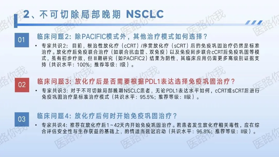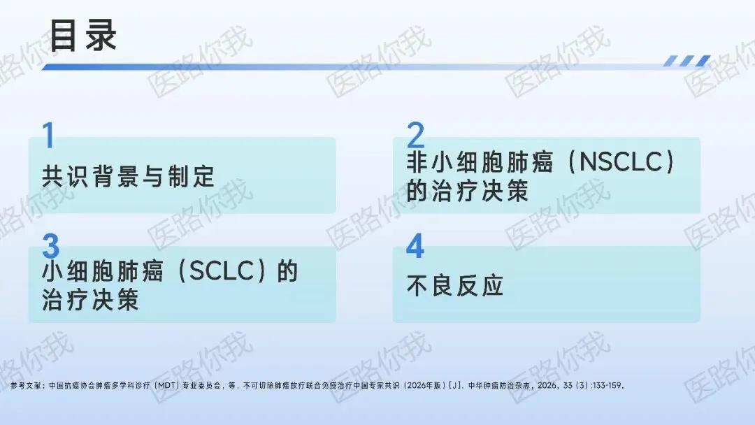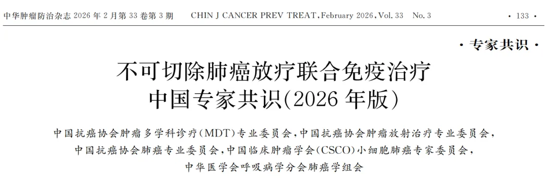 参考文献:中国抗癌协会肿瘤多学科诊疗(MDT)专业委员会,等. 不可切除肺癌放疗联合免疫治疗中国专家共识(2026年版)[J]. 中华肿瘤防治杂志,2026,33(3):133-159.DOI:10.16073/j.cnki.cjcpt.2026.03.01