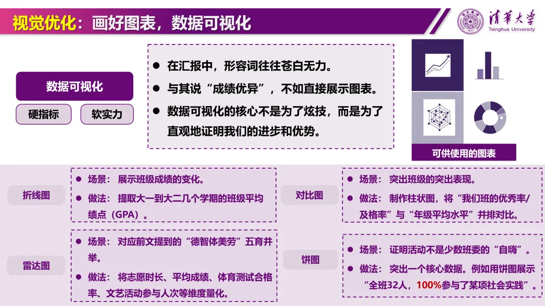 优质PPT是内容与视觉的双向赋能,应当将文字初稿优化为打动评委的优质展示。他建议跳出全文照搬的模式,通过提炼关键词、图文结合、数据可视化呈现核心指标;将温度融入细节,将信息传递转化为情感共鸣,展示表达的诚意与力量。