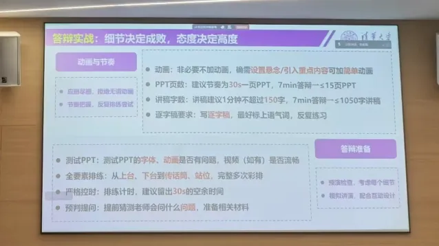 学长详细拆解了从PPT制作到现场展示的答辩全流程,并分享了实现理想答辩状态的方法:根据真实场景撰写讲稿,参考30秒/页、150字/分钟的信息密度、结合自身特点把控节奏;开展全要素彩排,测试PPT效果,规范上下台细节,严格控时并预留空余时间;提前预判并准备提问内容,以扎实的内容储备从容应对。