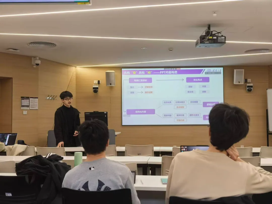 唐子航学长从PPT框架设计入手,系统讲解金字塔原理与MECE原则的实战应用,指导大家先明确汇报目标与受众,采用总分结构、分模块搭建内容框架。针对内容堆砌、逻辑混乱、亮点模糊等常见误区,学长结合自身甲团答辩经历分享经验:其曾因内容冗余陷入焦虑,后通过反复打磨框架、提炼亮点,实现表达从杂乱到聚焦、从平淡到有力的转变,强调PPT的核心价值在于梳理思维、传递信念。