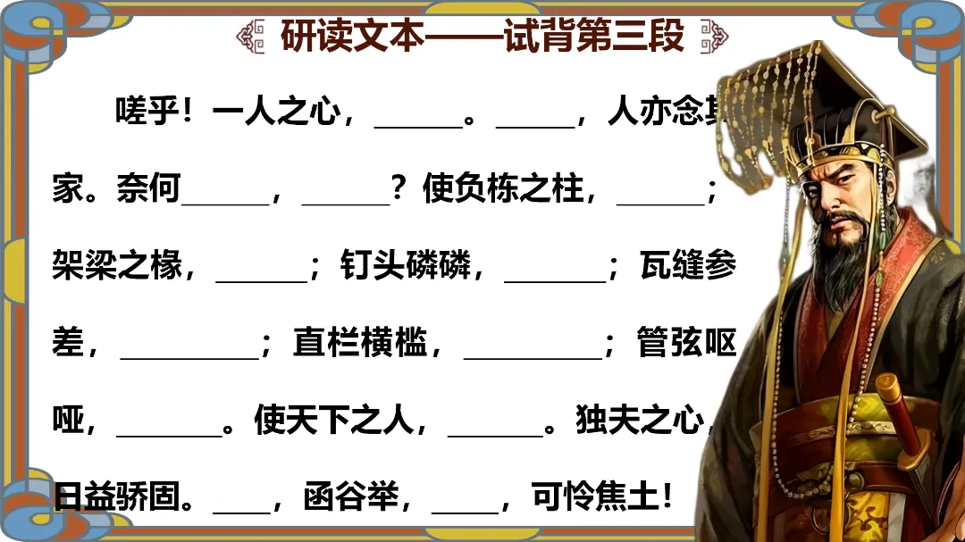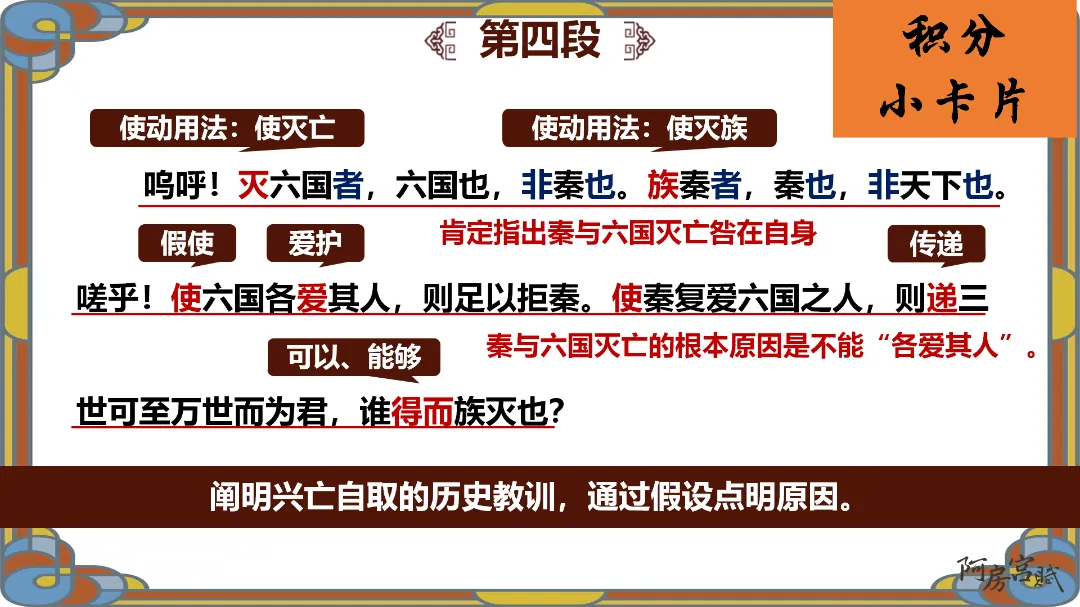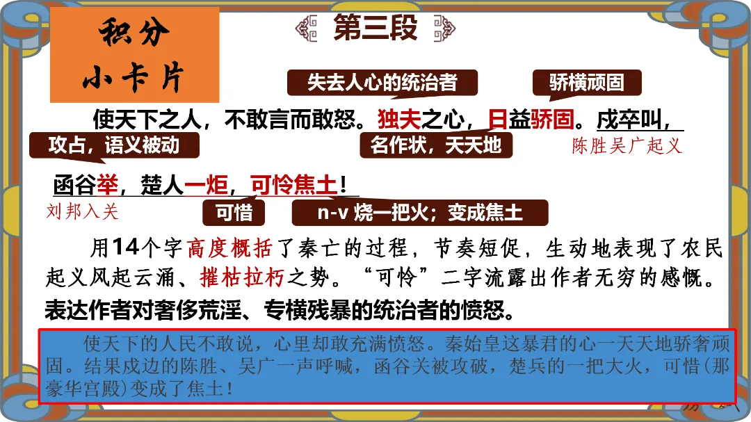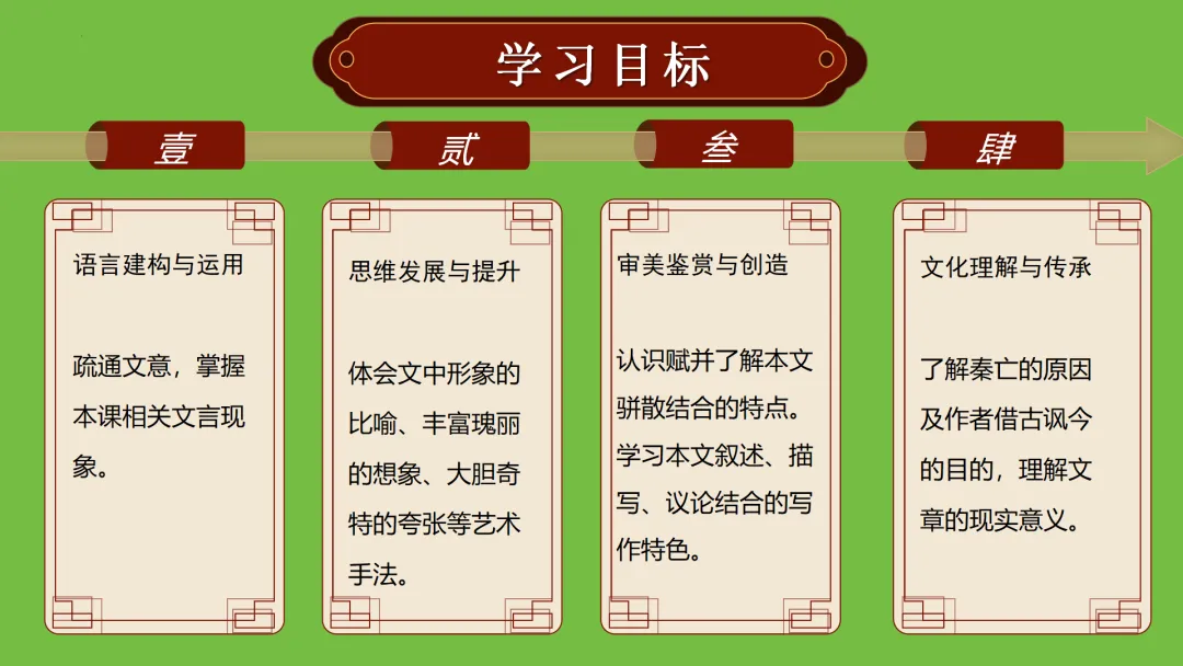 文化理解与传承:了解秦亡的原因及作者借古讽今的目的,理解文章的现实意义。