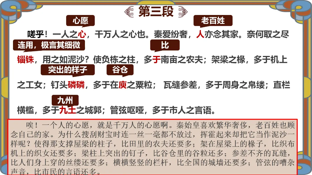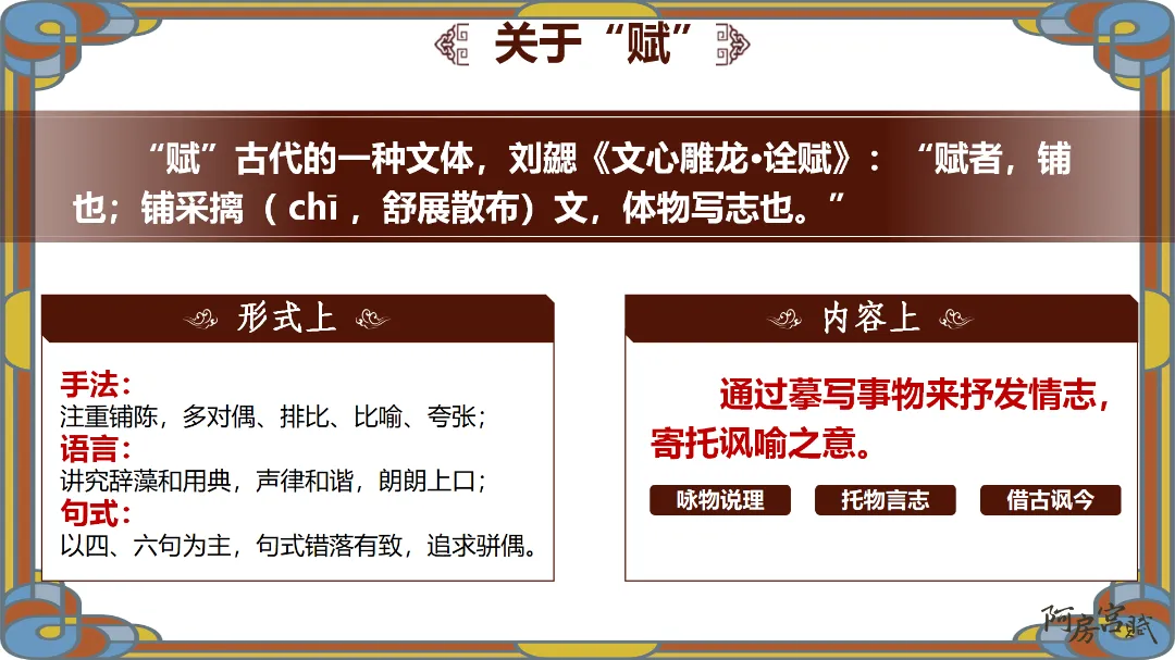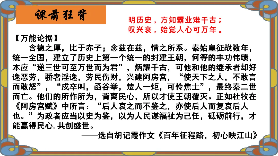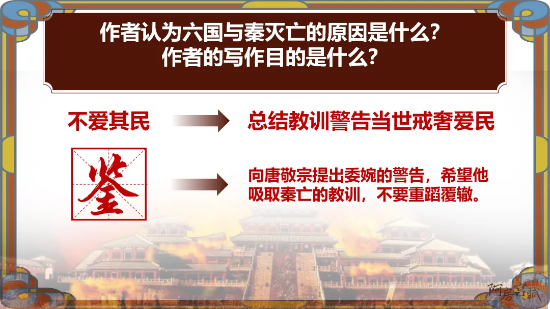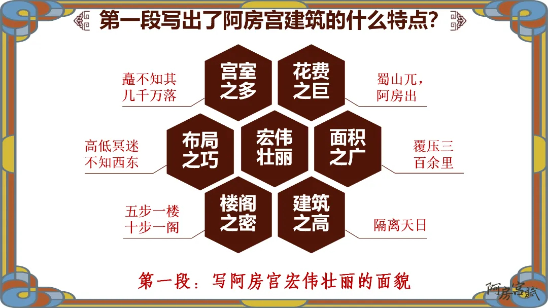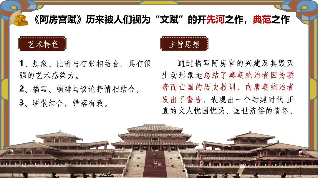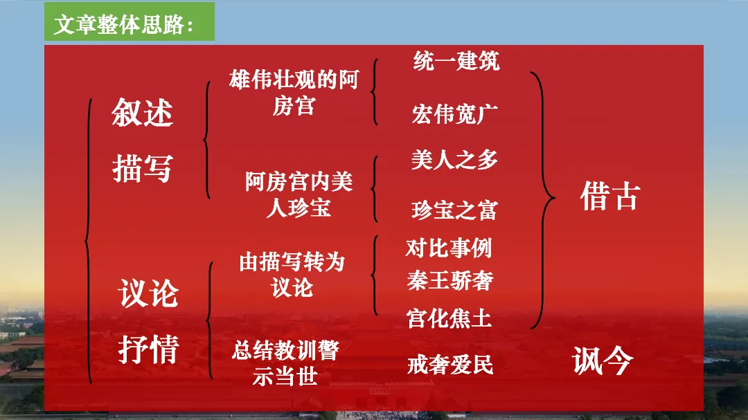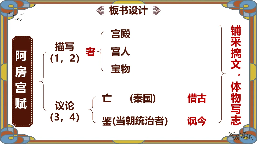 教师总结:文章先铺陈阿房宫的奢华,再议论秦亡的教训,由事入理,层层递进,尽显赋体“体物写志”的精髓。