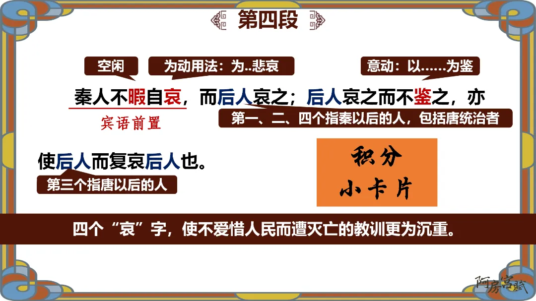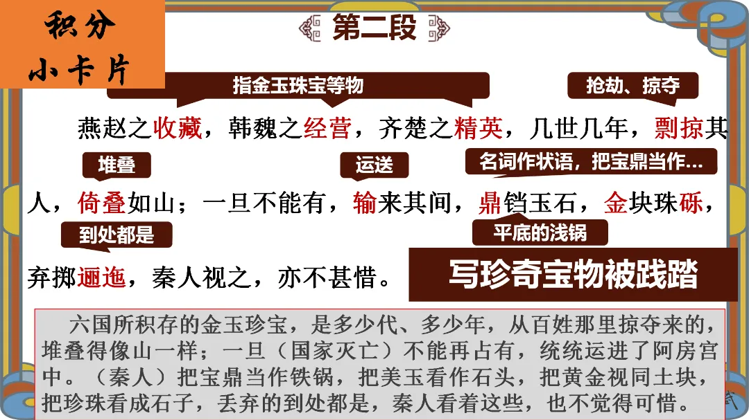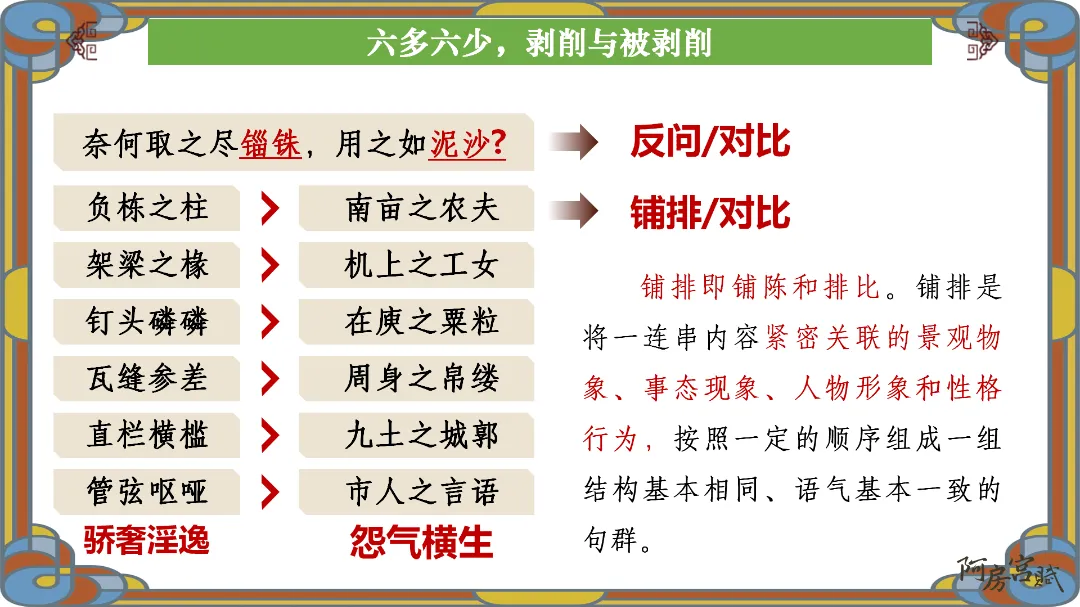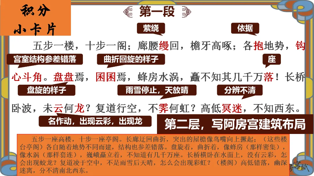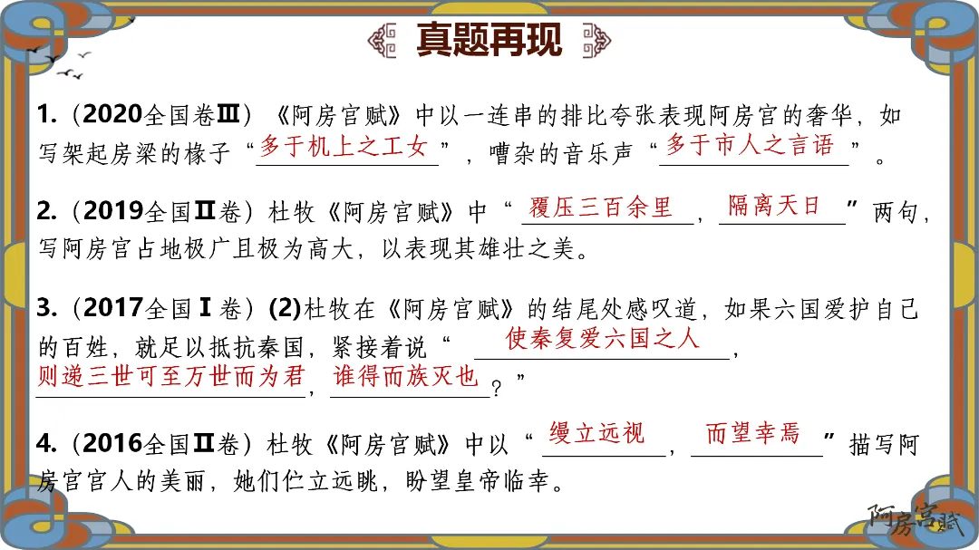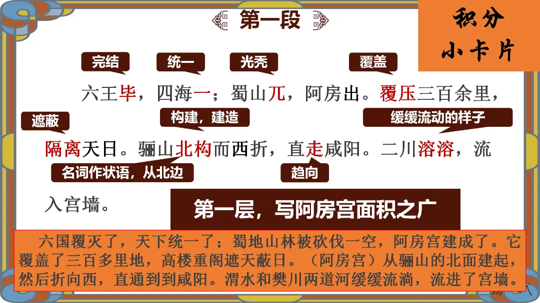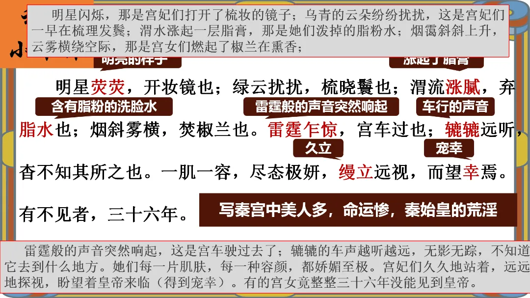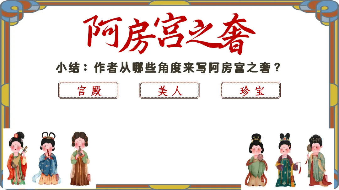 教师总结:文章先铺陈阿房宫的奢华,再议论秦亡的教训,由事入理,层层递进,尽显赋体“体物写志”的精髓。