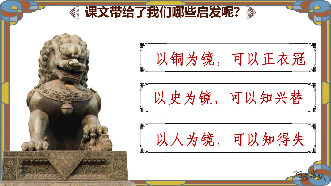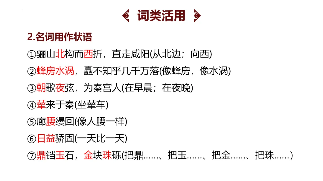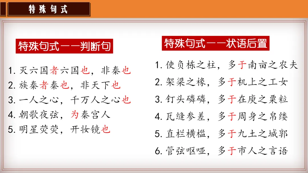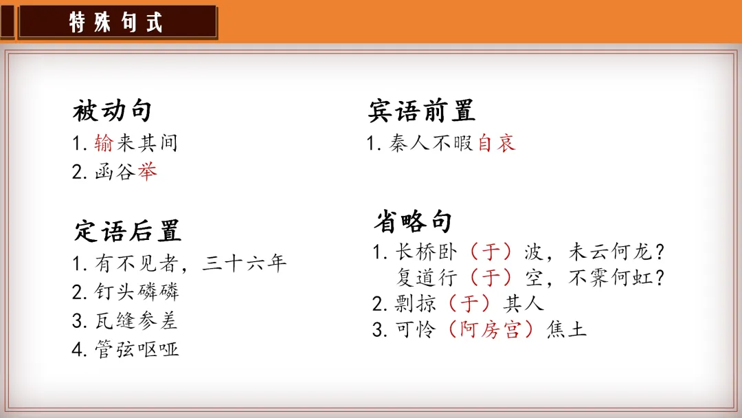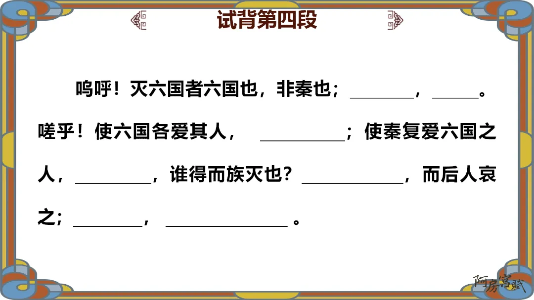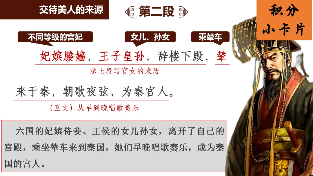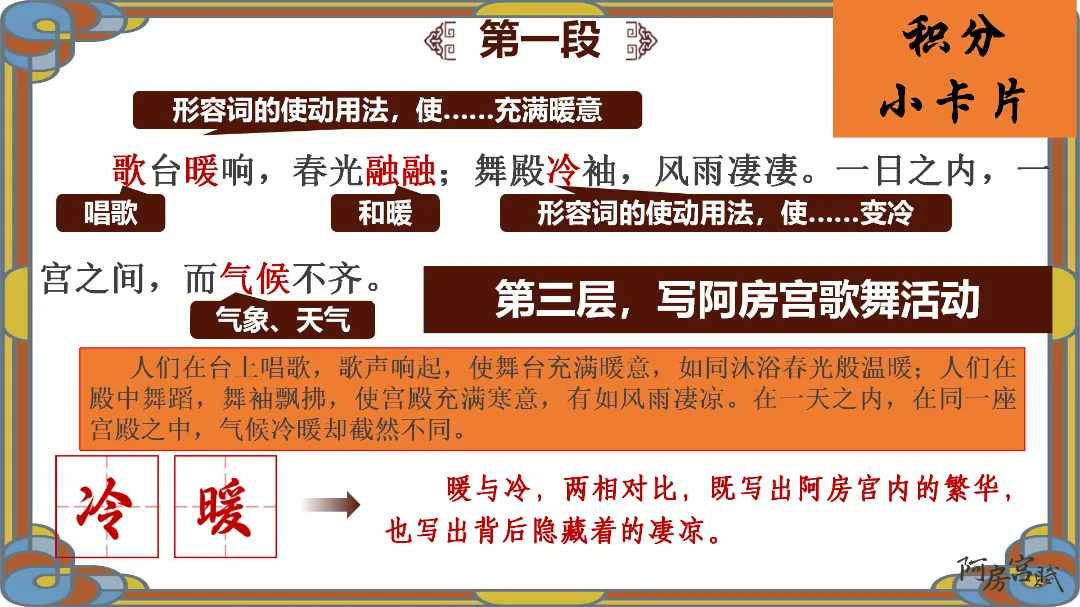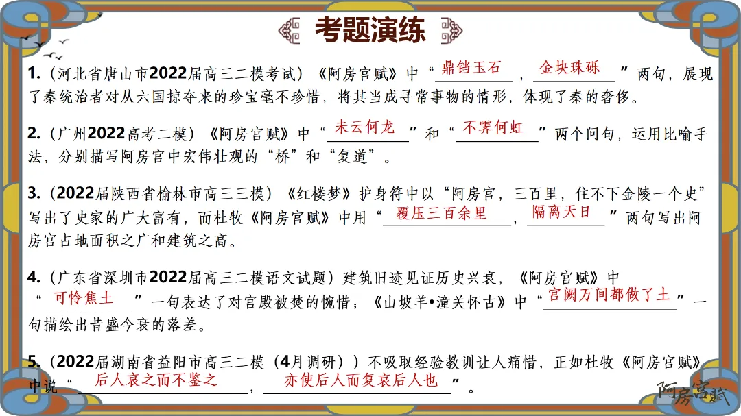 教师总结:文章先铺陈阿房宫的奢华,再议论秦亡的教训,由事入理,层层递进,尽显赋体“体物写志”的精髓。