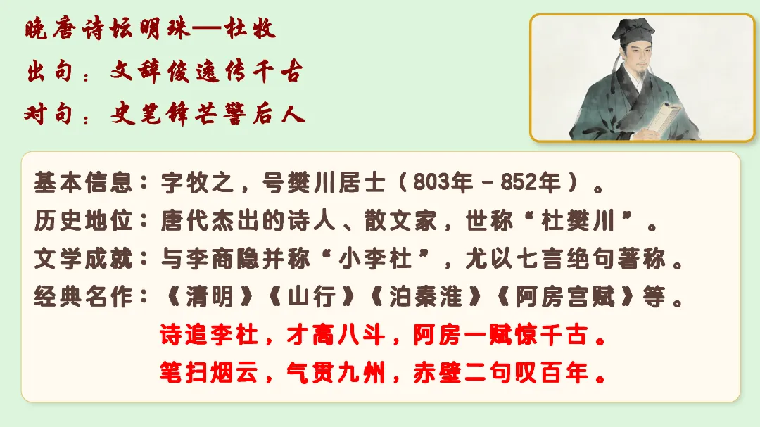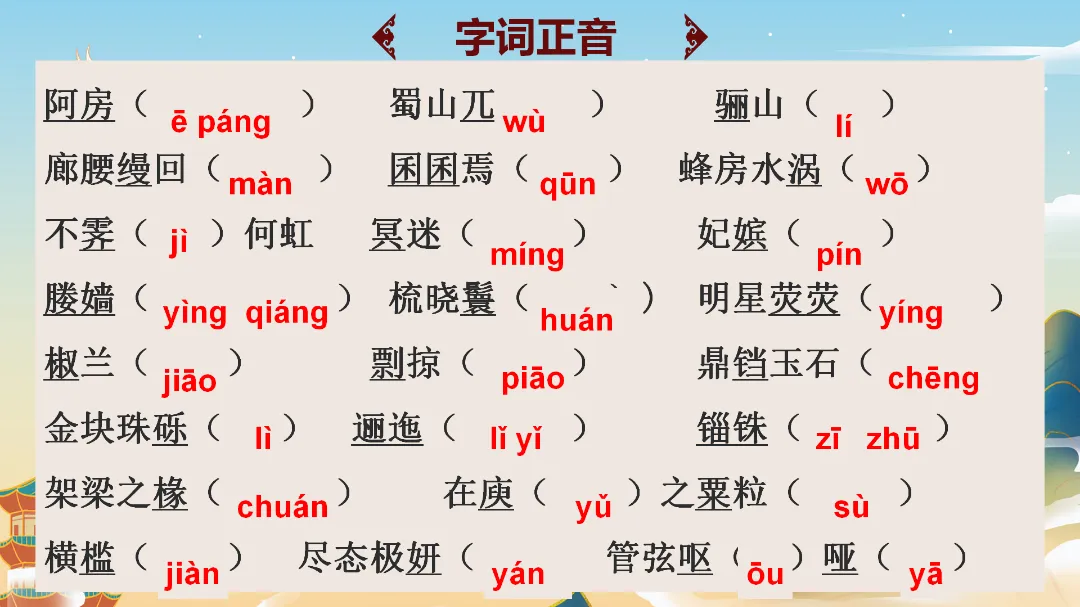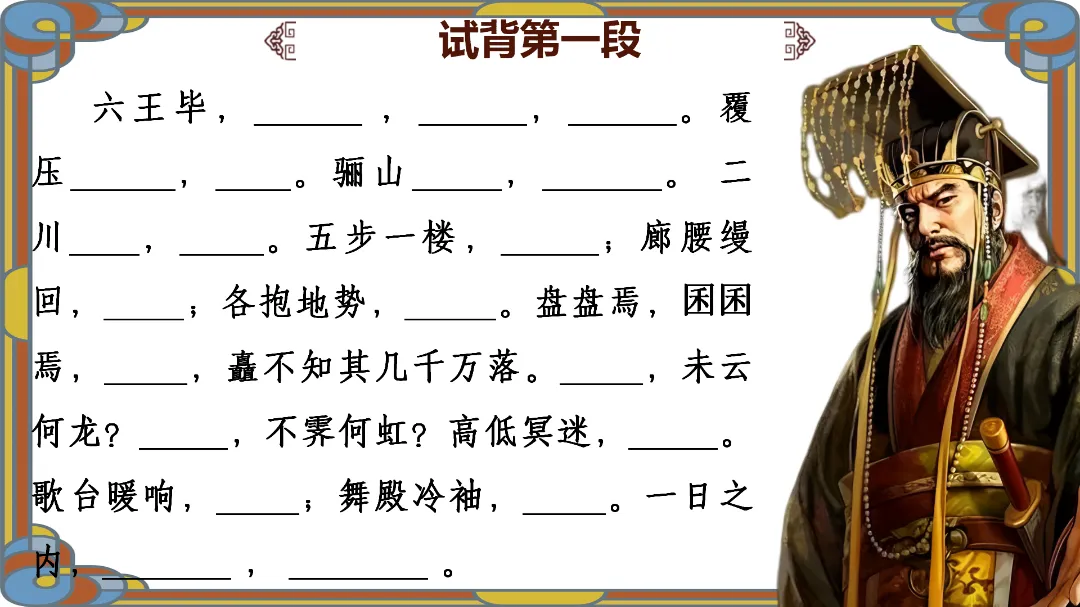 趣味设问:抛出“历史盲盒”问题:“如果穿越到秦朝,你是阿房宫里的工匠、宫女,还是普通百姓?你会经历什么?”快速调动学生好奇心,自然引出课题《阿房宫赋》,简单介绍杜牧与“赋”的文体特点,强调赋“铺采摛文,体物写志”的核心。