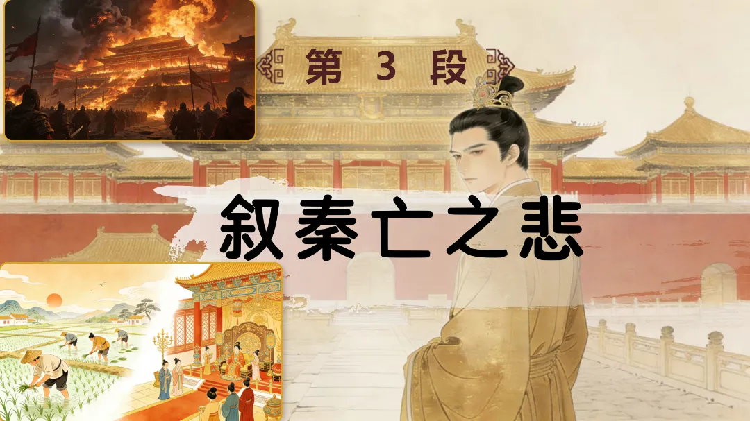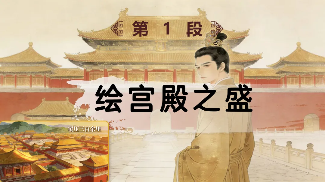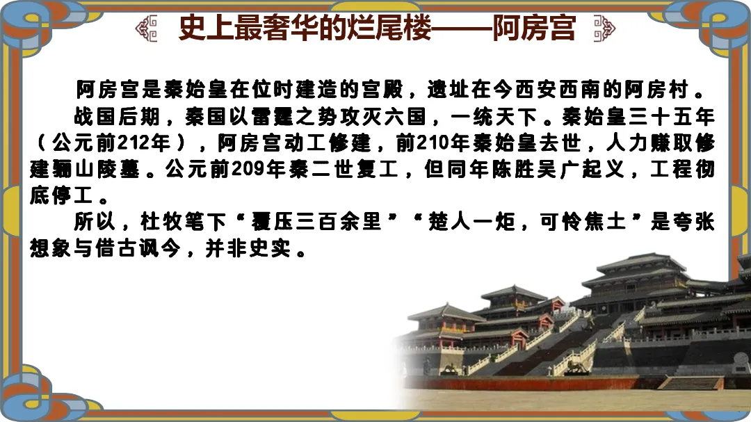 视觉冲击:播放含阿房宫3D复原动画的朗诵视频,展示宫殿巍峨、楼阁连绵的盛景,搭配古风背景音乐,提问:“这座被誉为‘天下第一宫’的建筑,究竟有多奢华?它为何会化为一片焦土?”