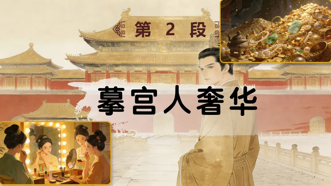 分组绘景:让学生默读课文1-2段,每组选取一个场景(宫殿建筑、宫女生活、珍宝收藏),用简笔画或语言描述的方式,还原文中画面,感受赋体铺陈夸张的写法。