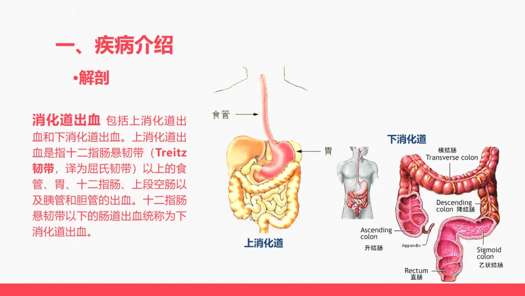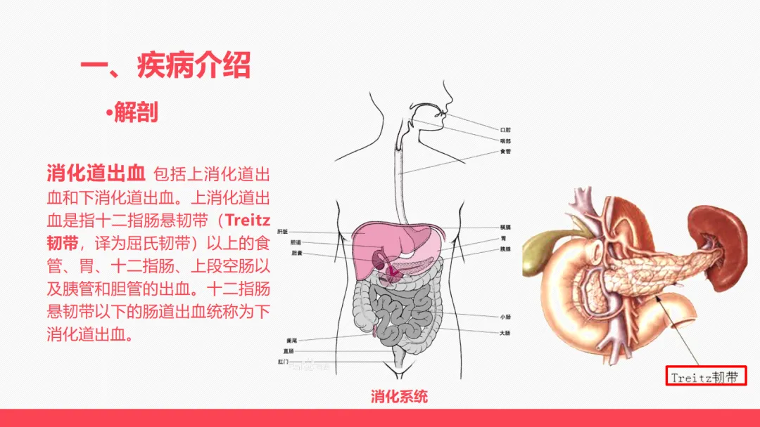 首先,我们先明确消化道出血的基本概念。消化道出血分为上消化道出血和下消化道出血,十二指肠悬韧带,也就是屈氏韧带以上的食管、胃、十二指肠、上段空肠,以及胰管和胆管出血,属于上消化道出血;屈氏韧带以下的肠道出血,则为下消化道出血。这是我们判断出血部位、制定救治方案的基础。