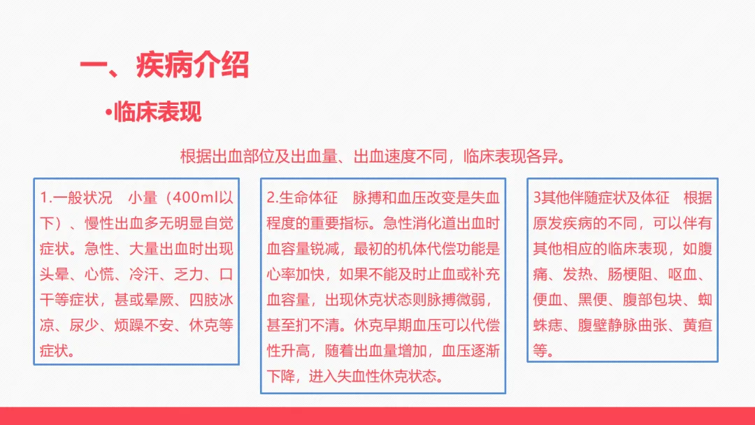 - 一般状况:小量、慢性出血(400ml 以下)多无明显症状;急性大量出血会出现头晕、心慌、冷汗、乏力,严重时晕厥、四肢冰凉、尿少,甚至休克。