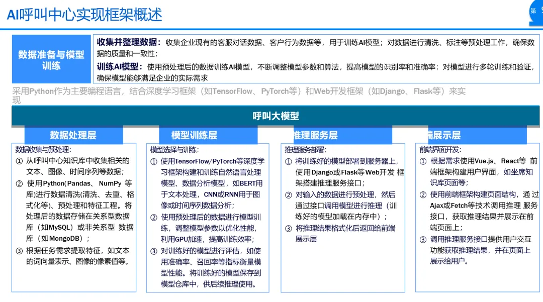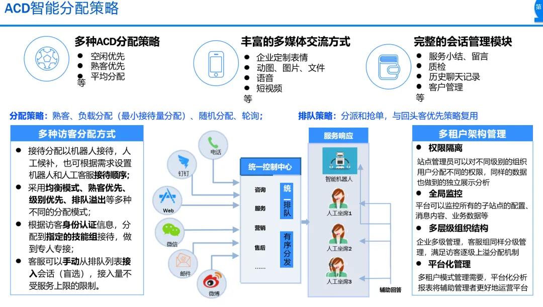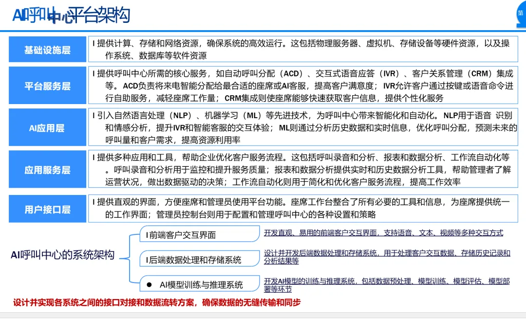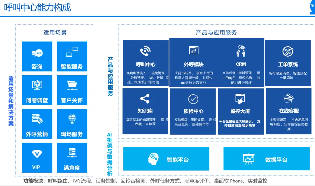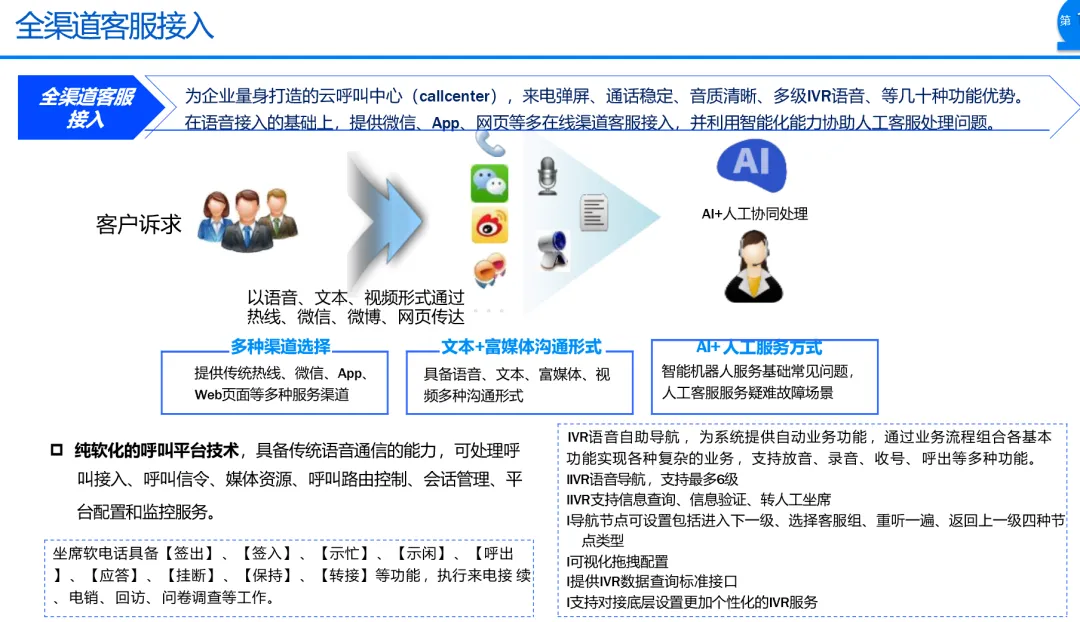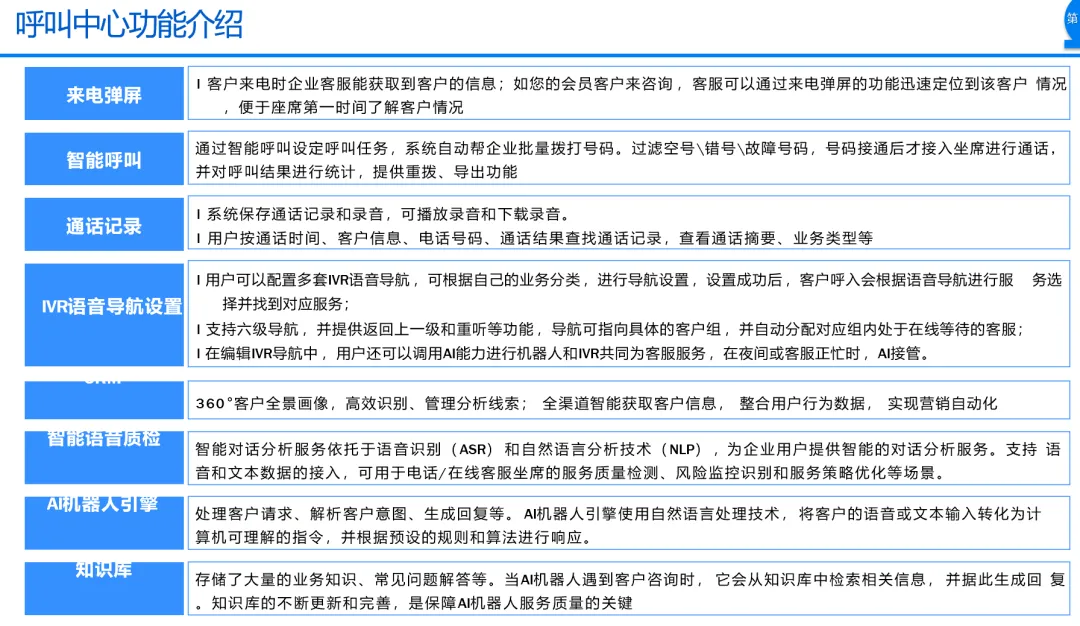 人工智能作为解决方案的核心大脑,贯穿呼叫中心的"接入-交互-运营-决策"全流程。在接入层,智能语音导航(IVR)通过自然语言处理(NLP)实现意图精准识别,替代传统按键菜单,客户直达率提升60%以上;在交互层,实时语音转写、声纹识别、情绪检测等技术构建数字坐席助手,自动推送知识库答案并预警高风险通话,辅助人工坐席高效应对复杂场景;在运营层,智能质检系统实现100%通话覆盖,替代传统人工抽检,合规风险识别准确率超95%;在决策层,预测式外呼与智能工单分配算法基于客户画像动态优化资源配置,使首次解决率(FCR)和客户满意度(CSAT)实现双提升。
