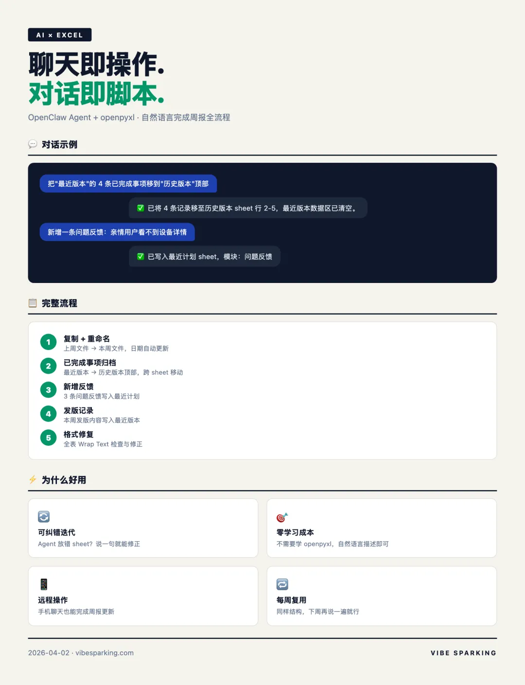 不打开 Excel,通过 OpenClaw 聊天对话就能完成周报的复制、归档、新增和格式修复。一个真实的 OpenClaw 操作 Excel 办公场景。