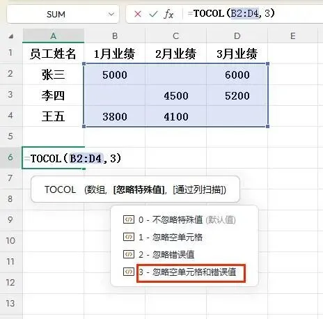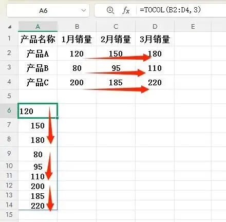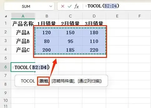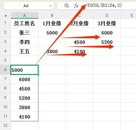 TOCOL函数解决方案: