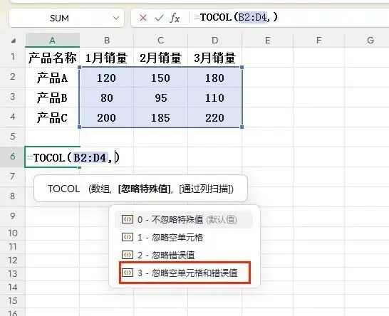 TOCOL函数的解决方法: