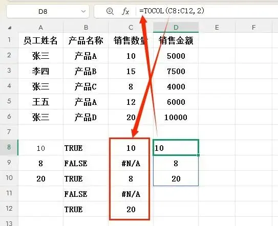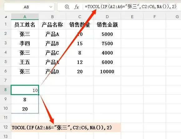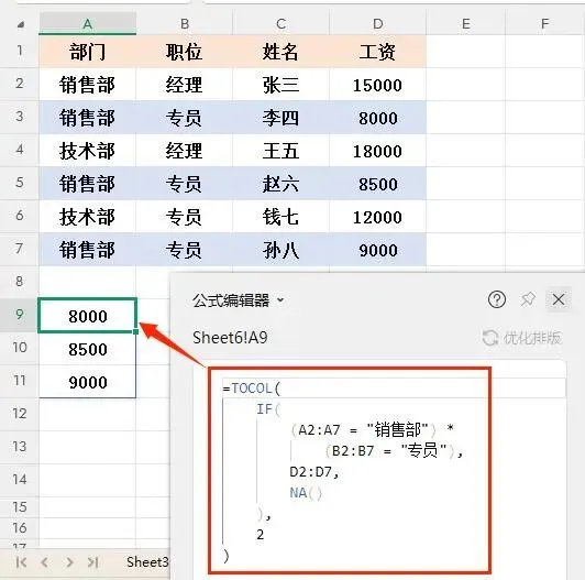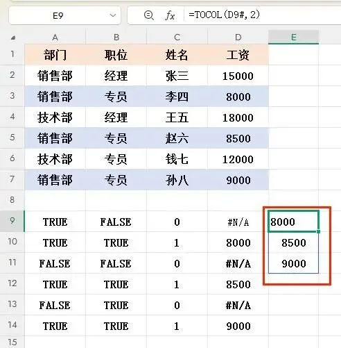 4. 加上TOCOL函数最终的返回结果:{8000;8500;9000}