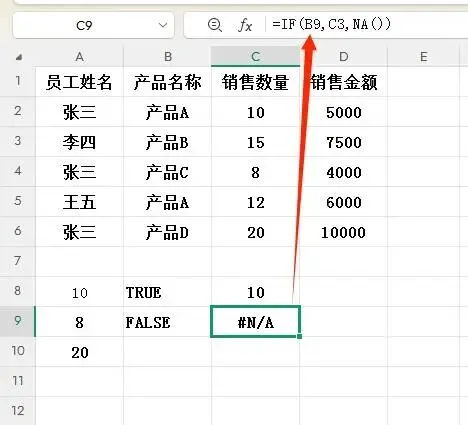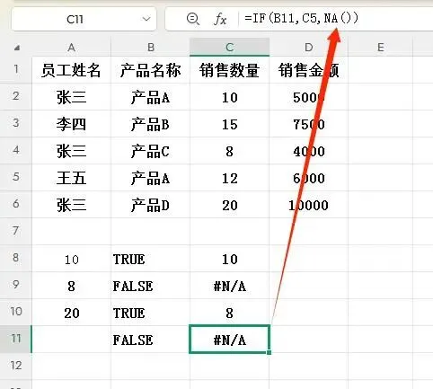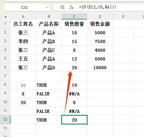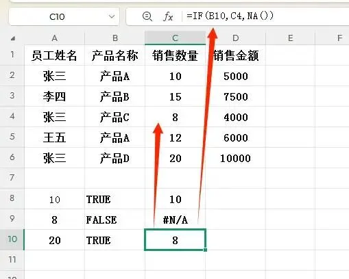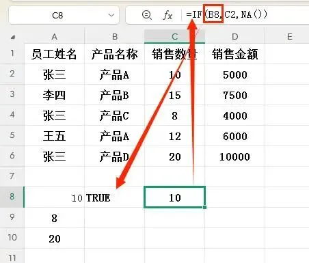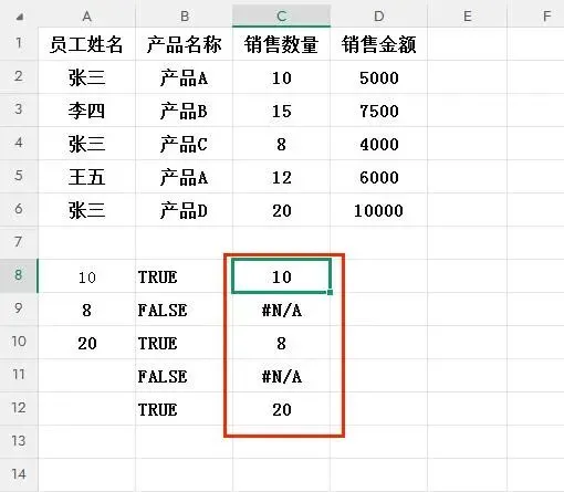 2. IF函数最终返回数组{10;#N/A;8;#N/A;20}