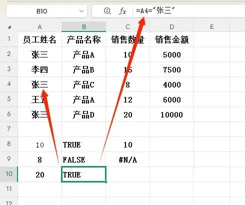 - A4="张三" → TRUE →