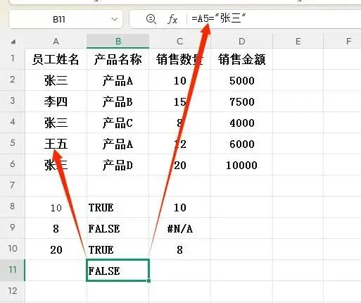 - A5="张三" → FALSE