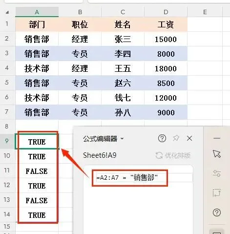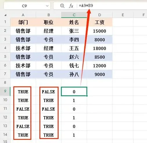 - A7&B7:销售部&专员 → 1*1=1 → TRUE → 返回D7的值9000