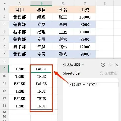 - (A2:A7="销售部")*(B2:B7="专员") 这一部分是要返回逻辑值数组