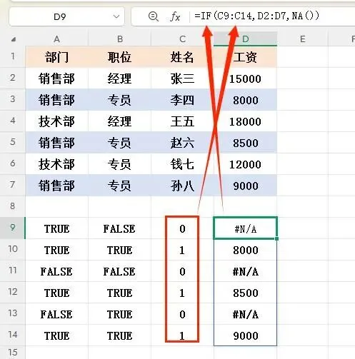 - A6&B6:技术部&专员 → 0*1=0 → FALSE → 返回NA()