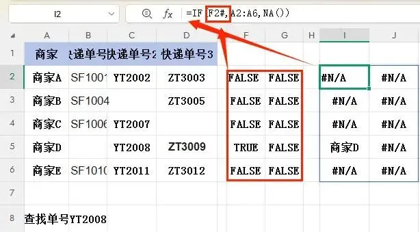 4. IF函数返回最终结果数组:{#N/A;#N/A;#N/A;#N/A;"商家D";#N/A}