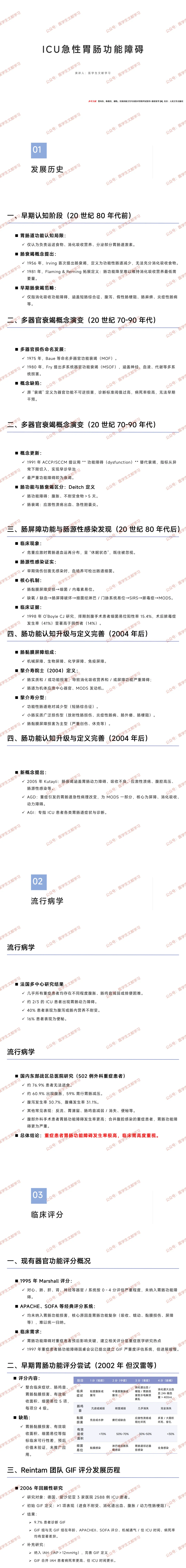 - Marshall 评分、APACHE、SOFA 等经典评分均未纳入胃肠功能障碍,因胃肠功能复杂难以统一评估。