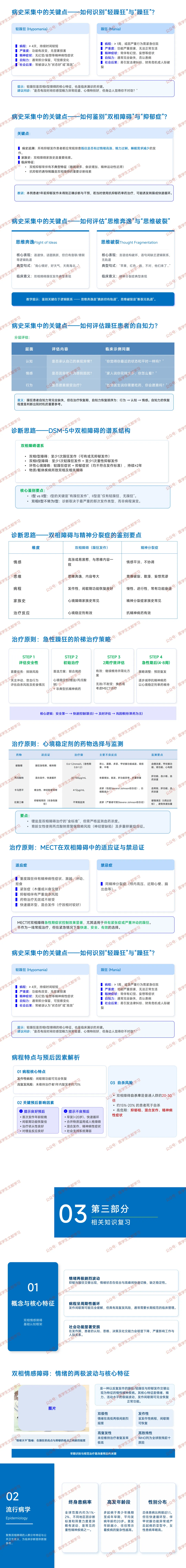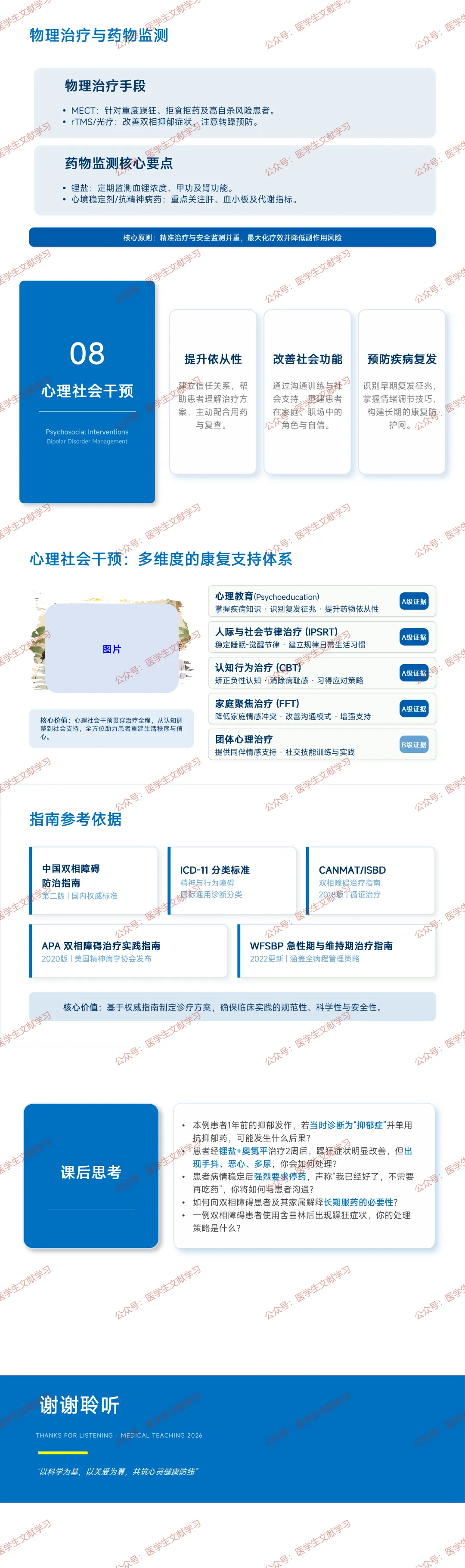 - 不良预后因素:早发、快速循环、混合发作、伴精神病性症状、社会支持薄弱。