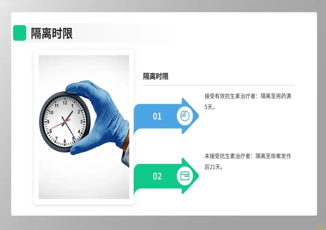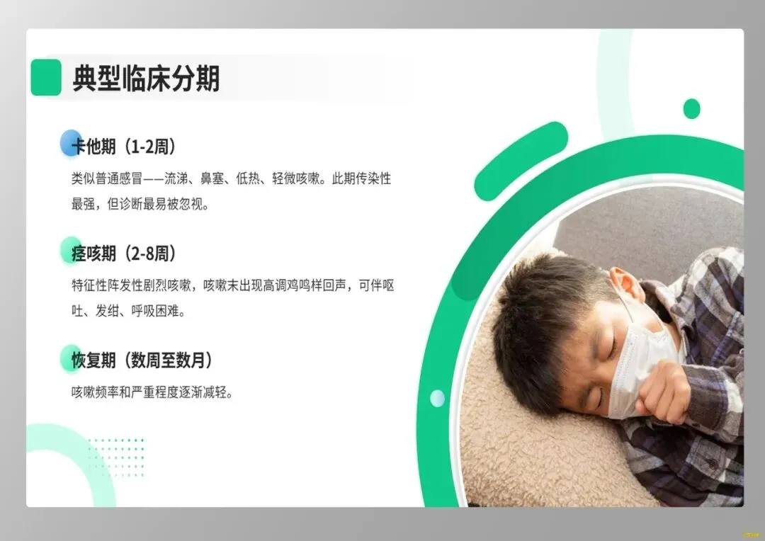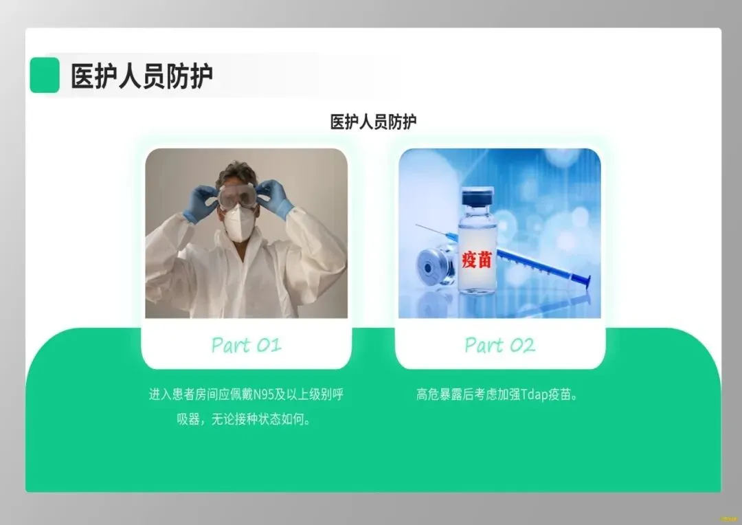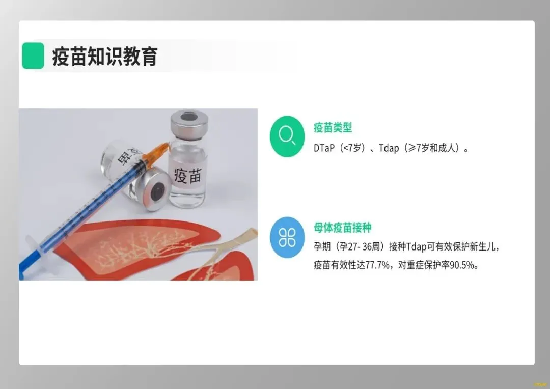 最后,健康教育是阻断传播链的关键。我们应向家属强调,患者需隔离至有效抗生素治疗满5天,未治疗者需隔离21天。同时,推荐孕妇在孕晚期接种Tdap疫苗,这是保护新生儿最有效的策略。