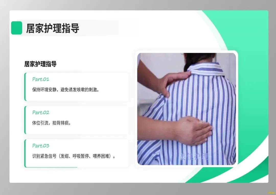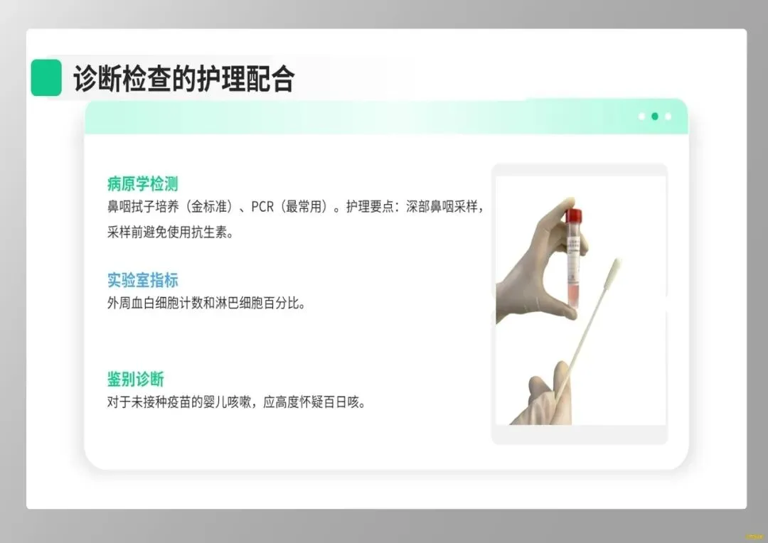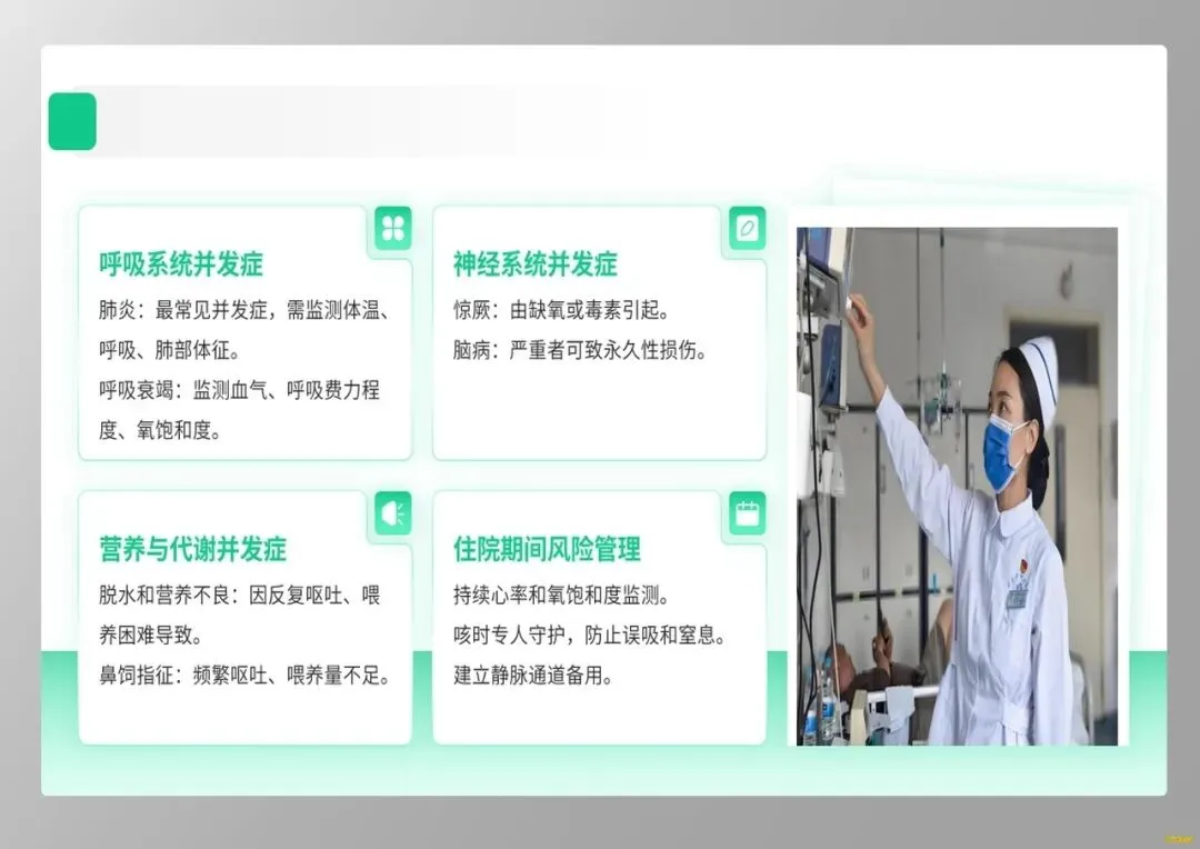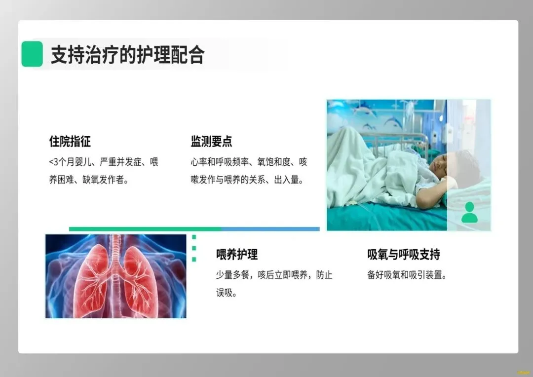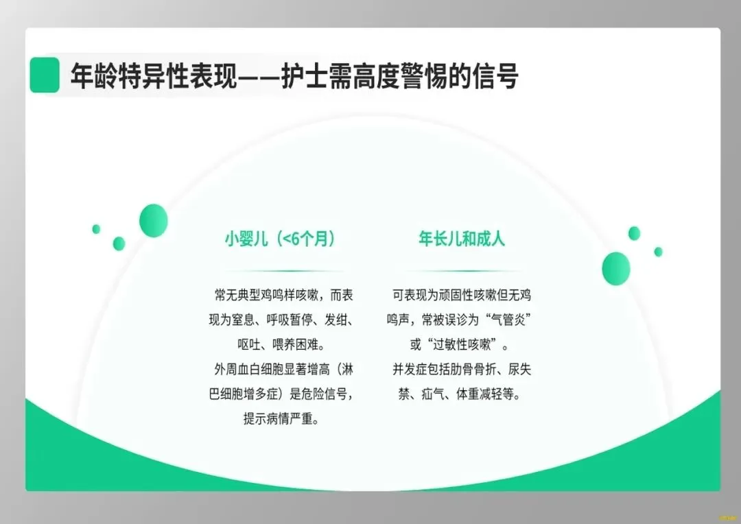 其次,在临床识别上,我们要警惕小婴儿的“伪装”。年龄小于6个月的婴儿常无典型鸡鸣样咳嗽,而表现为窒息、呼吸暂停、发绀,外周血白细胞显著增高是其重症预警信号。护士作为病情观察的前哨,需敏锐捕捉这些非典型症状,为抢救争取时机。