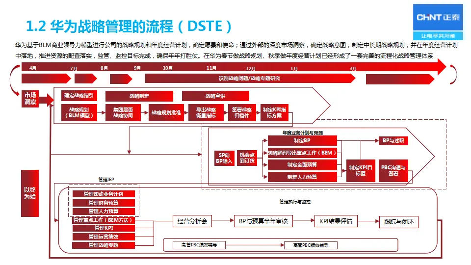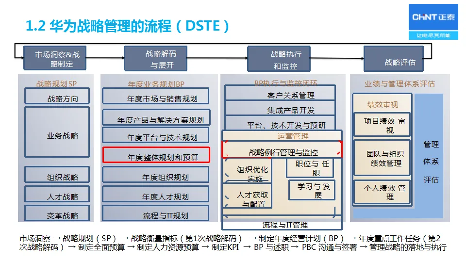 华为的战略管理核心是DSTE(从战略到执行) 流程,它是一个闭环系统,贯穿全年: