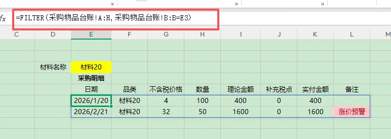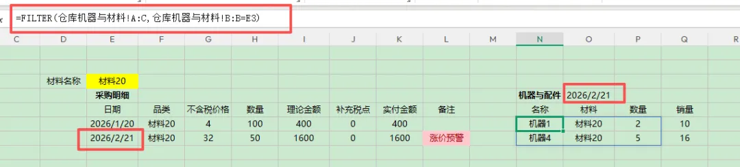日常工作中,采购人员需要根据仓管的需求,采买即将使用完的零件或材料,同时采购人员需要保证采买的这些零配件与材料都用在了机器上,所以还需要监控仓库到底有没有制作出这么多机器,以及销售有没有卖出这么多机器。2.现在想统计出采购的材料到底有没有做这么多的机器,就要明确做一个机器需要消耗哪些材料?3.采购还想知道仓管报货时,他报的这些材料到底有没有用完,以及每次的进价价格有没有出入。分析需求:这个表是采购部门看的,搭建看板要以采购的材料为主,以销售的订单及机器的制作为辅。当采购需要买材料时,输入这个材料名字,会出现之前所有的采购价格同时我还要根据销售订单去判断仓库的材料有没有用完。销售订单数据源里边只有机器的数量,没有相应的材料,所以我们需要先提取出使用该材料的机器品类,也是用filter实现再去销售表里匹配该机器在最后一次采买材料后的销量(也可以对比总销量),用sumifs条件求和,也可以加上时间区间条件。小公司可以直接对比数量,如果真的用完了就可以及时采购。也可以根据一天消耗量以及采购周期,去更精确的评估是否需要采购。