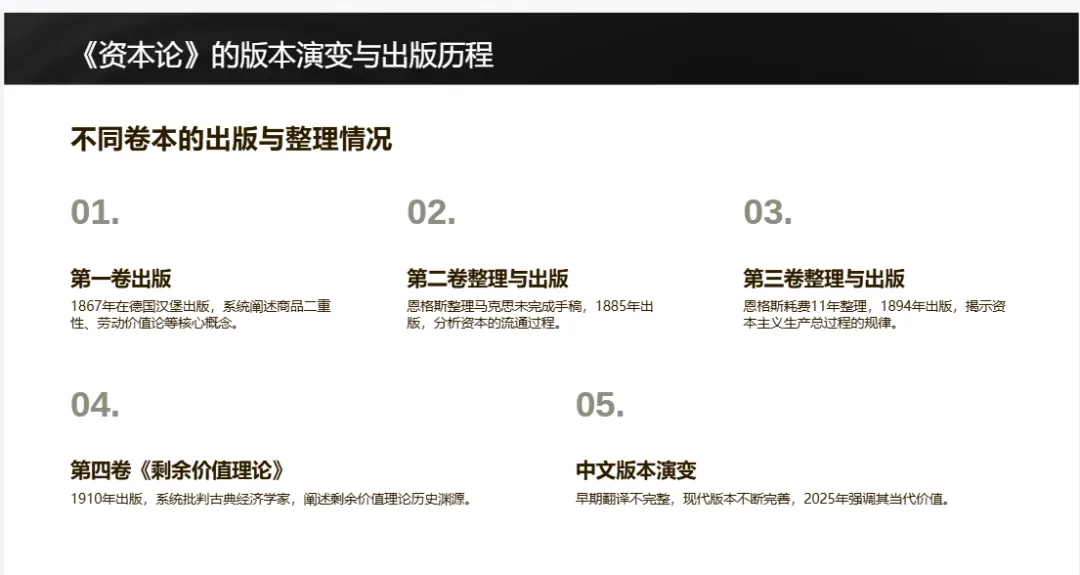 卡尔·马克思作为马克思主义奠基人,在移居伦敦后系统研究政治经济学,撰写《资本论》手稿。《资本论》三卷本出版历程体现了马恩合作:1867年第一卷在汉堡出版,聚焦资本生产过程;1885年恩格斯整理出版第二卷,分析资本流通过程;1894年恩格斯耗时11年整理出版第三卷,阐述资本主义生产总过程;1910年考茨基整理出版第四卷《剩余价值理论》。中文版本历经发展,2009年纳入《马克思恩格斯文集》,当代中国学界重点探讨其对当代经济现象的指导意义。
