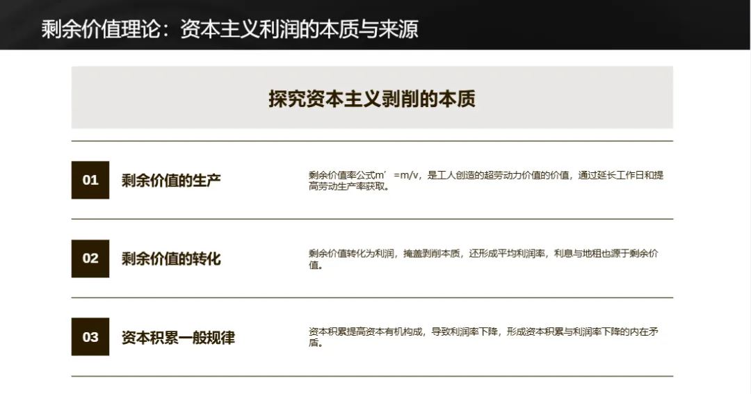 剩余价值理论是核心,剩余价值由工人创造的超过其劳动力价值的部分构成,通过绝对剩余价值(延长工作日)和相对剩余价值(提高劳动生产率)两种形式产生,后转化为利润、利息、地租等形式,掩盖剥削本质。资本积累必然导致资本有机构成提高,引发内在矛盾。