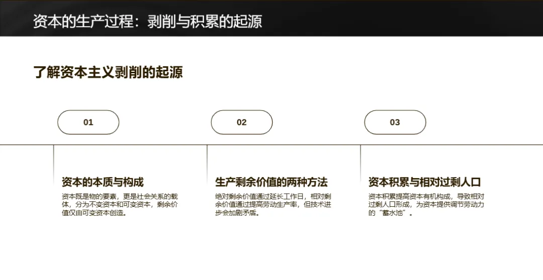 资本生产过程中,资本分为不变资本(转移价值)和可变资本(创造价值),资本积累导致相对过剩人口,形成产业后备军,强化资本家对工人的剥削。