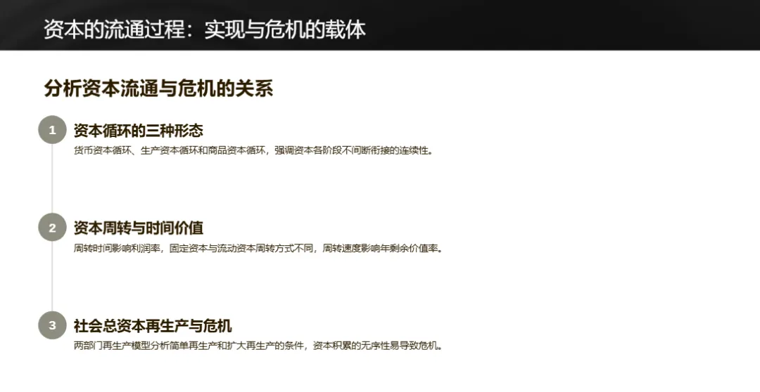 资本流通过程中,资本循环分为货币资本、生产资本、商品资本三种形态,周转速度影响年剩余价值率;社会总资本再生产分为生产资料和消费资料两大部类,比例失调会引发流通危机。