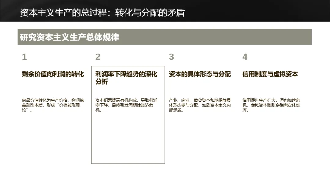资本主义生产总过程中,商品价值转化为生产价格,剩余价值在产业资本、商业资本、金融资本和地主间分配,信用制度和虚拟资本膨胀加剧危机隐患。