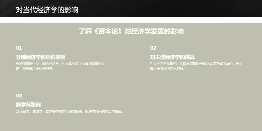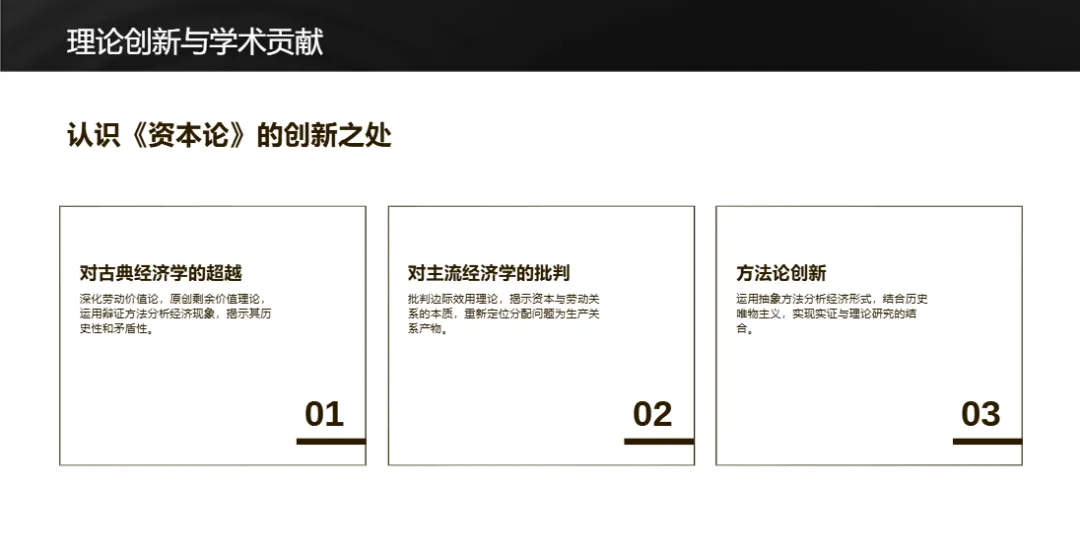 《资本论》超越古典经济学,创新剩余价值理论和辩证分析方法,批判主流经济学对资本的工具性理解。其理论成为后凯恩斯主义、生态马克思主义等异端经济学的基础,对社会学、政治学等学科影响深远。