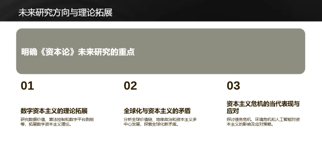 《资本论》的核心矛盾和方法论在当代仍具生命力,虽需结合数字经济、全球化等新情况拓展理论,但对批判资本主义、构建公平社会具有不可替代的价值。未来应聚焦数字资本主义、全球资本积累、资本主义危机新形态等研究方向,传承其批判精神,为实现更公平的社会经济制度提供支撑。