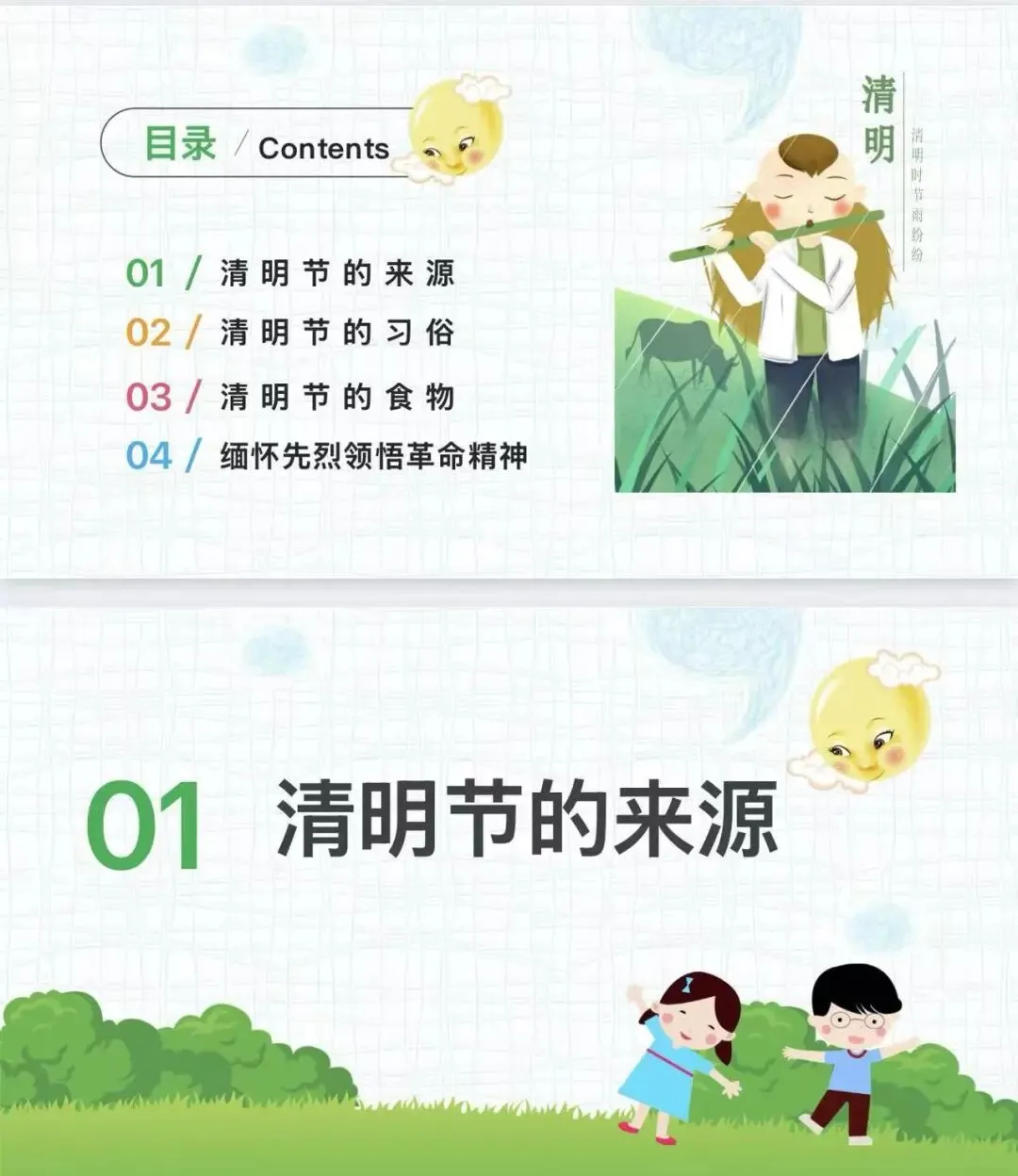 清明节活动主题PPT,包含清明节的起源/缅怀革命先烈等内容,免费下载