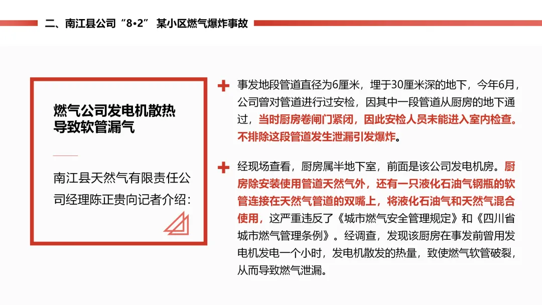 一楼半地下室厨房,有人把液化气钢瓶和天然气管道混接,软管还被旁边发电机的热量烤裂漏气,又没开窗通风,气体聚多了炸了,2 死 24 伤,83 户居民受灾。而且燃气公司之前安检时,因为厨房门关着没进去查,没发现这个重大隐患。
