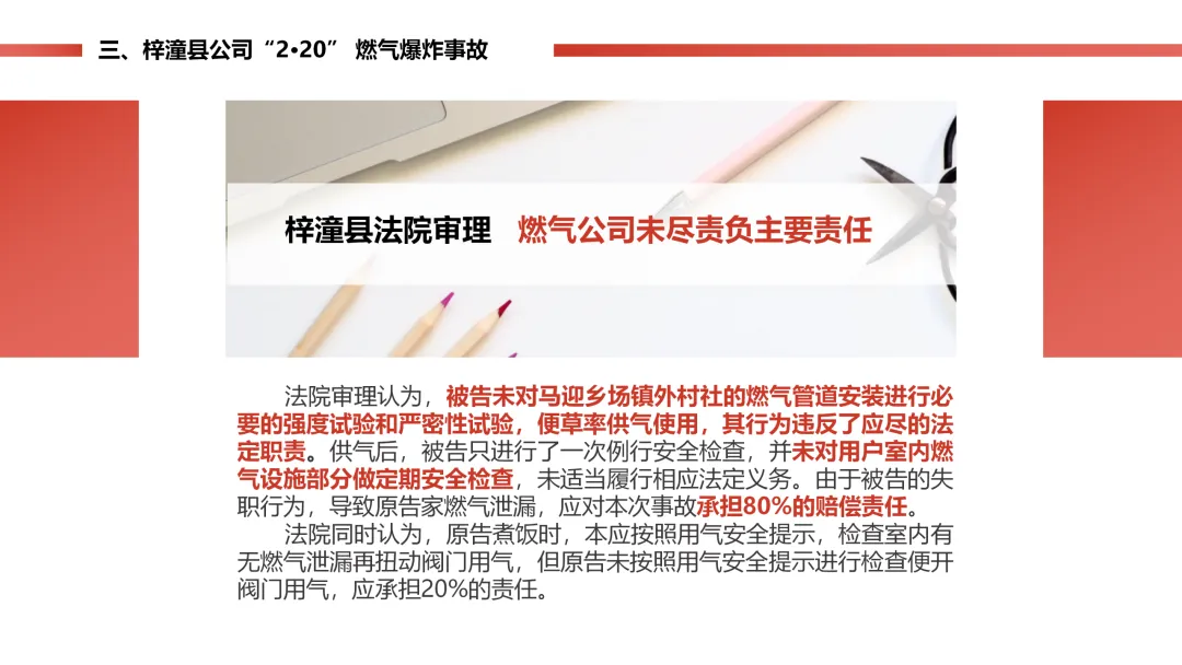 村民开燃气煮饭时被炸伤,法院判燃气公司担 80% 责任。因为燃气公司给村里装的管道,供气前没做安全压力测试,后续也没定期入户检查;村民自己没检查漏气就开阀,担 20% 责任。还顺带说了乡镇燃气的通病:私拉乱接、用气环境乱、管道埋得浅、安全员管理不到位等。